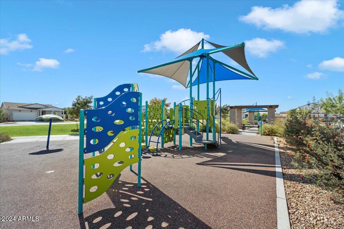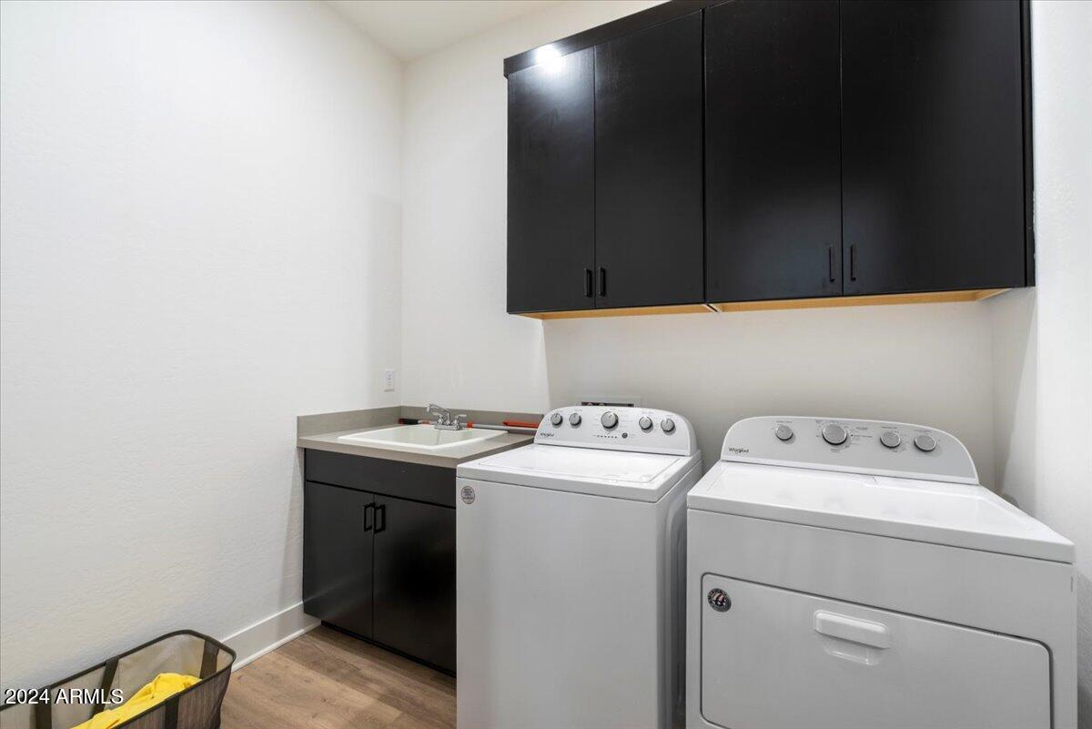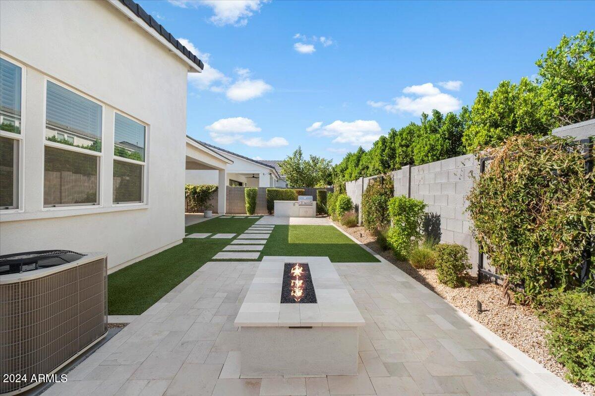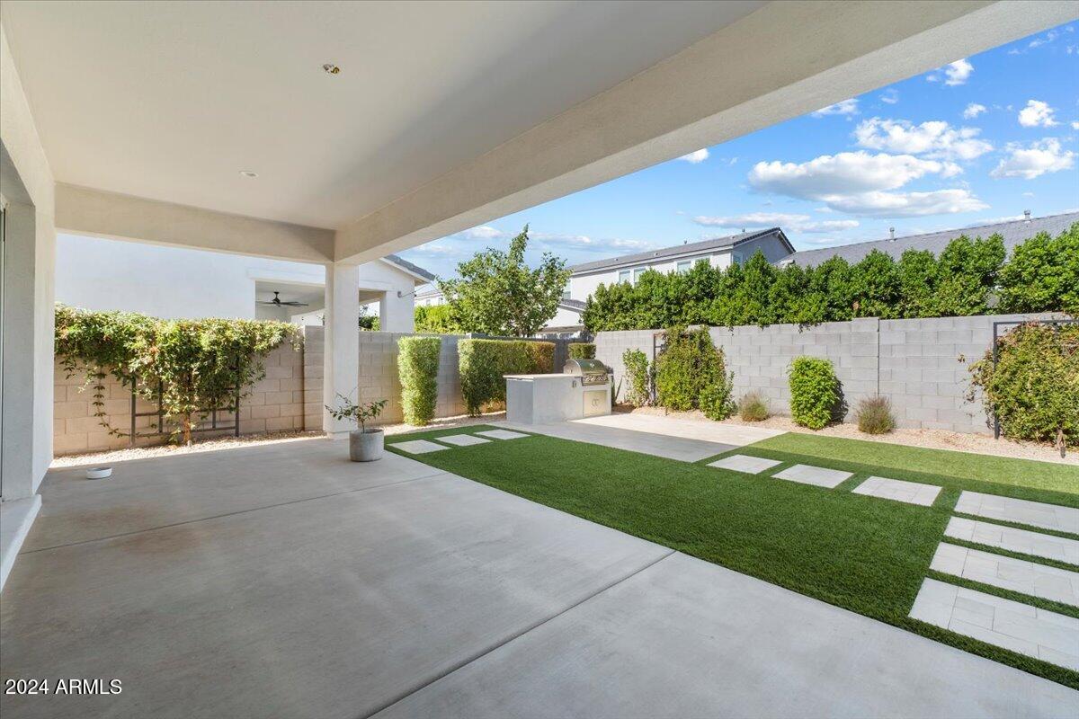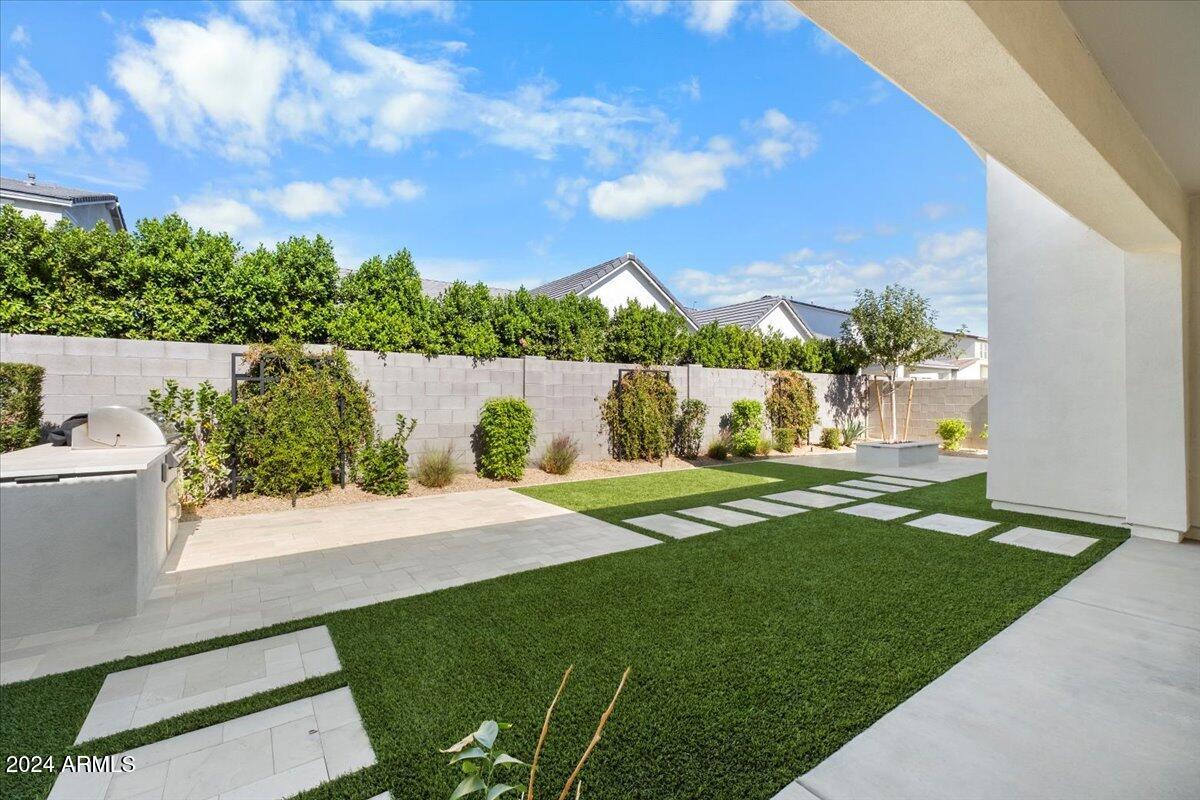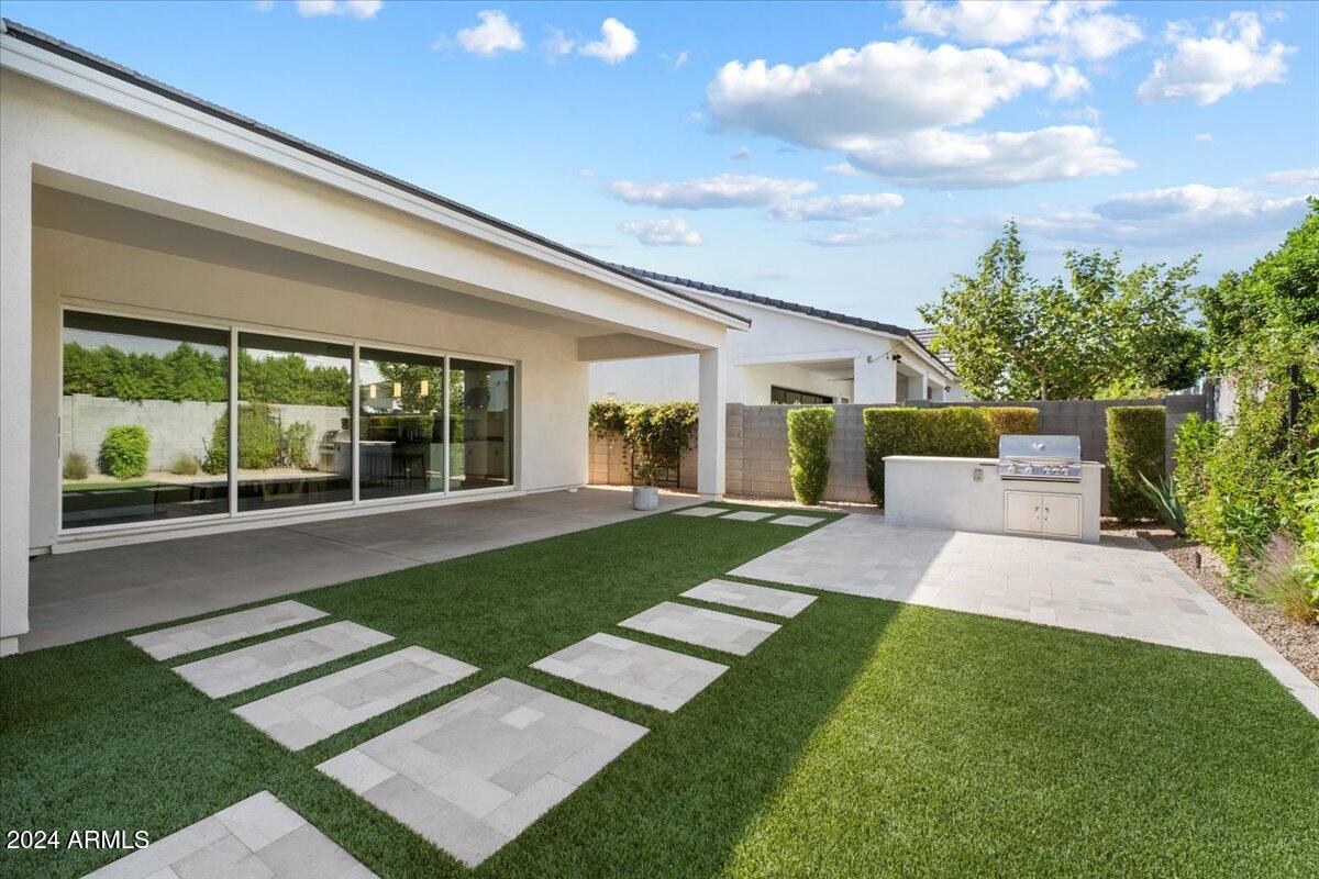 Outdoor living is made seamless with a 20-foot sliding glass door that opens to an inviting backyard, complete with a built-in BBQ grill and fire pit, ideal for entertaining or relaxing under the Arizona sky. The laundry room is thoughtfully designed with a sink and cabinetry, providing additional convenience.