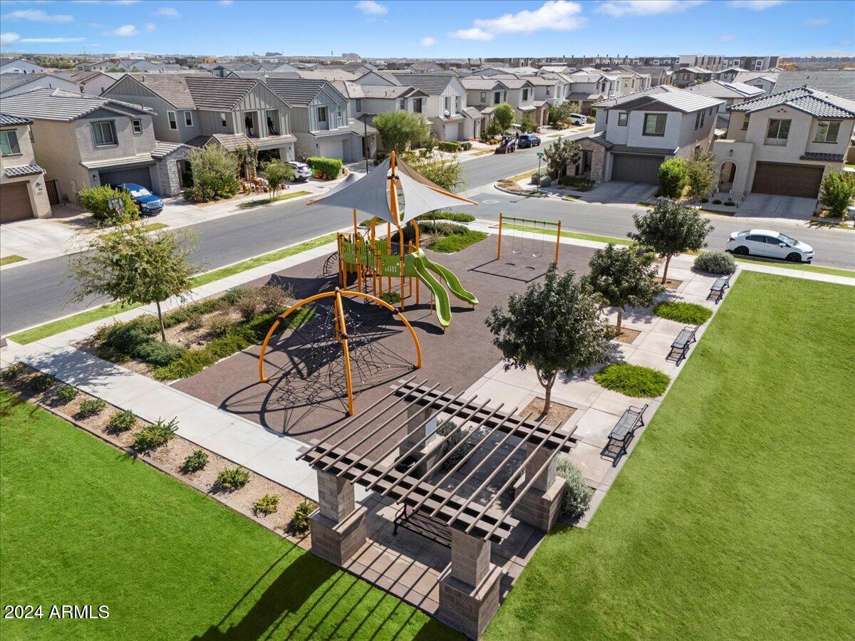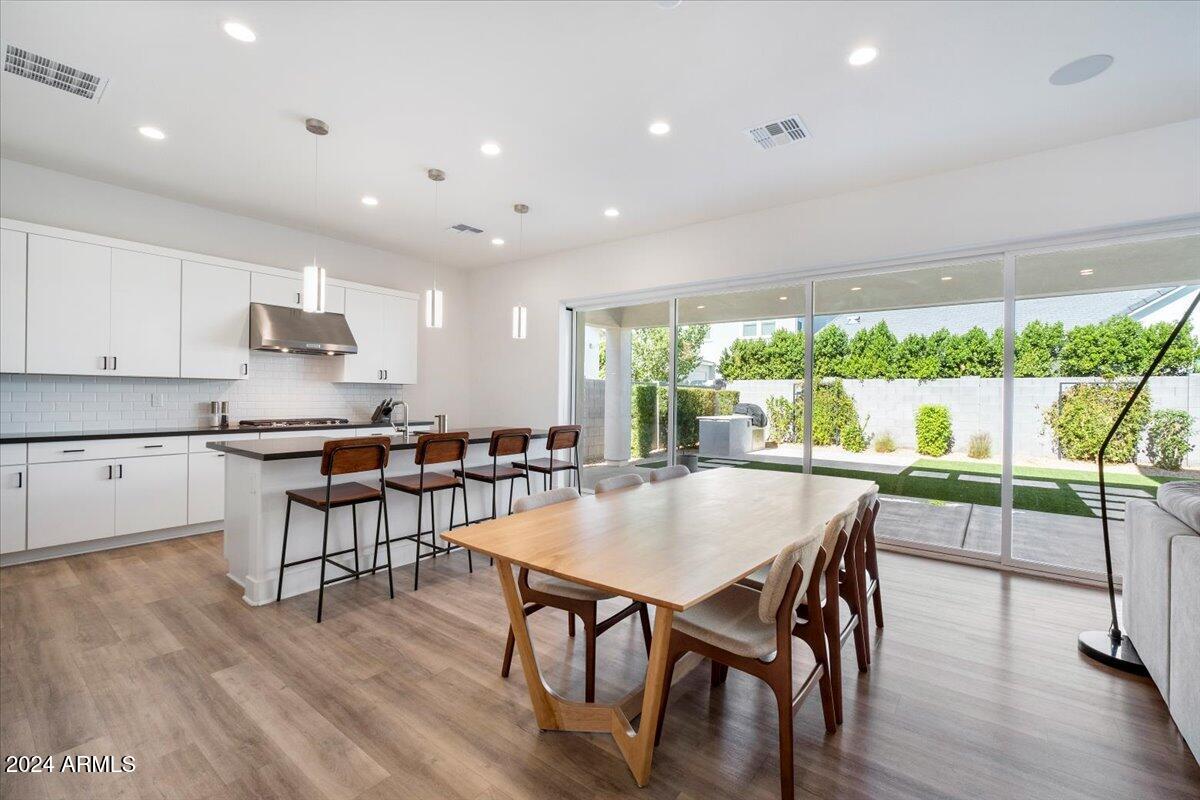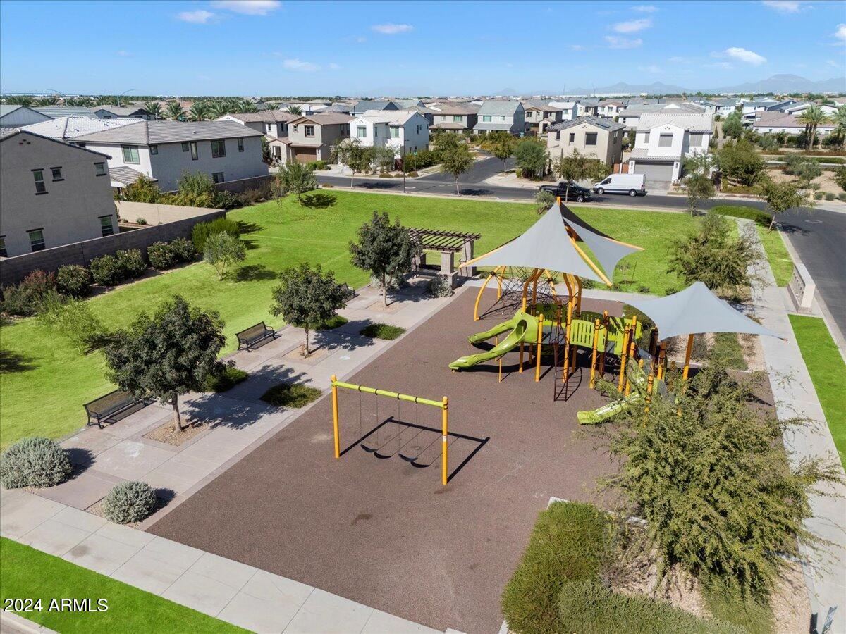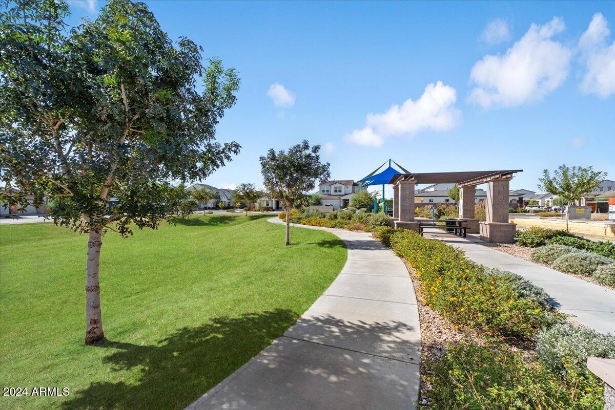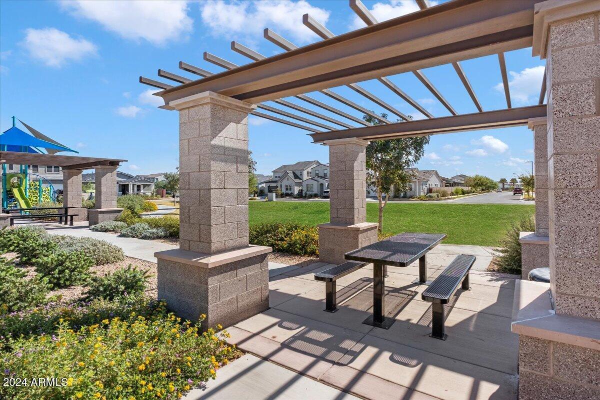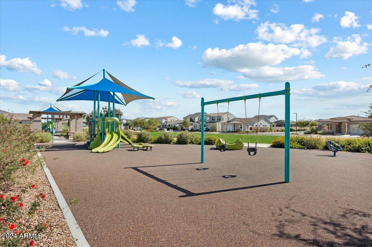 Outdoor living is made seamless with a 20-foot sliding glass door that opens to an inviting backyard, complete with a built-in BBQ grill and fire pit, ideal for entertaining or relaxing under the Arizona sky. The laundry room is thoughtfully designed with a sink and cabinetry, providing additional convenience.