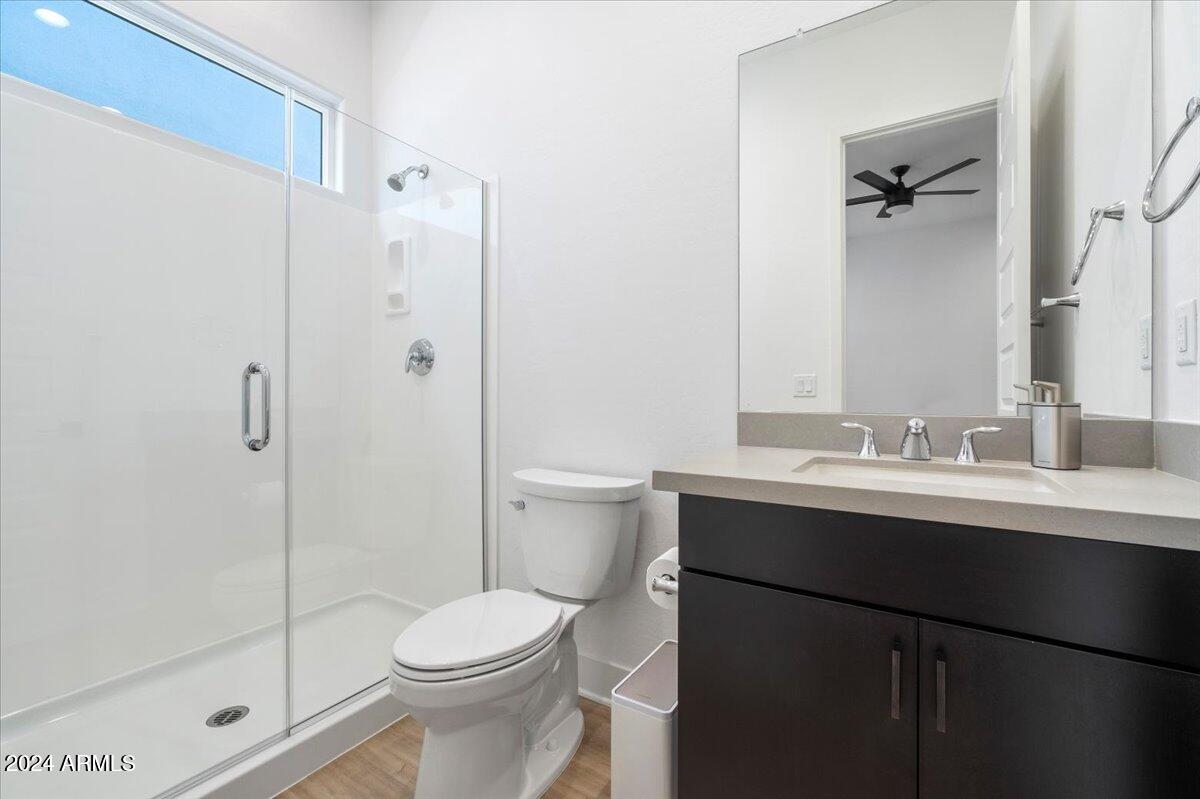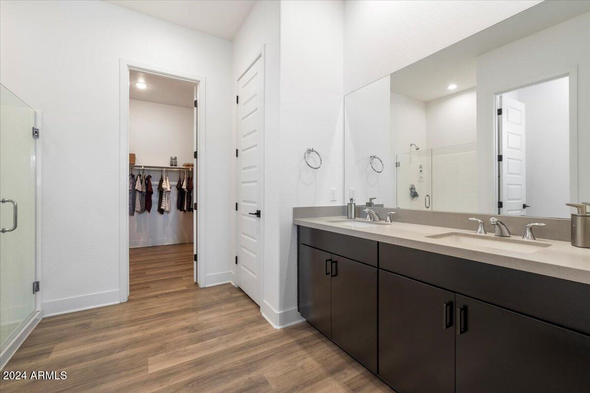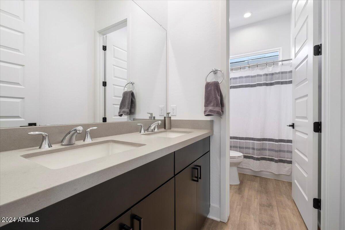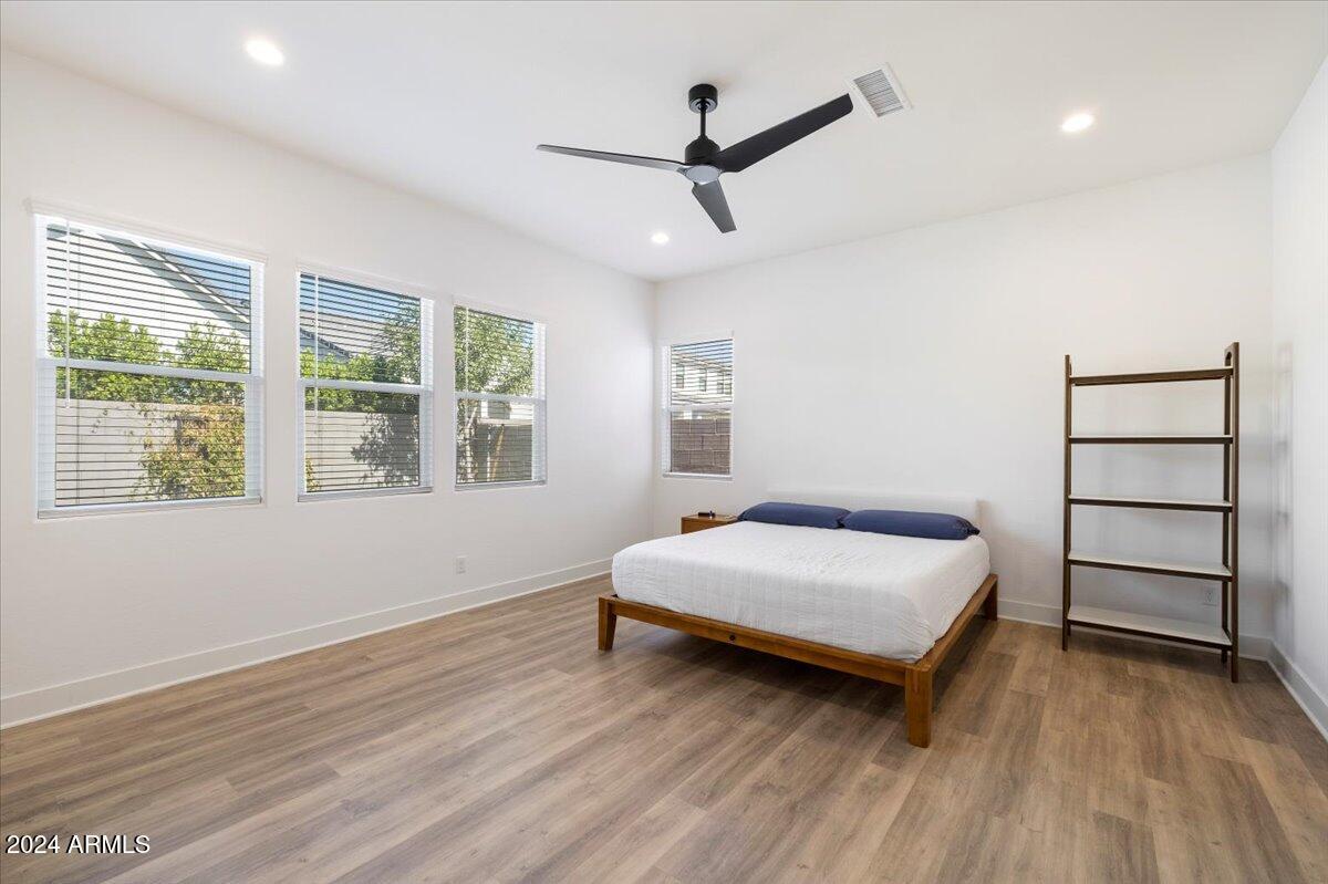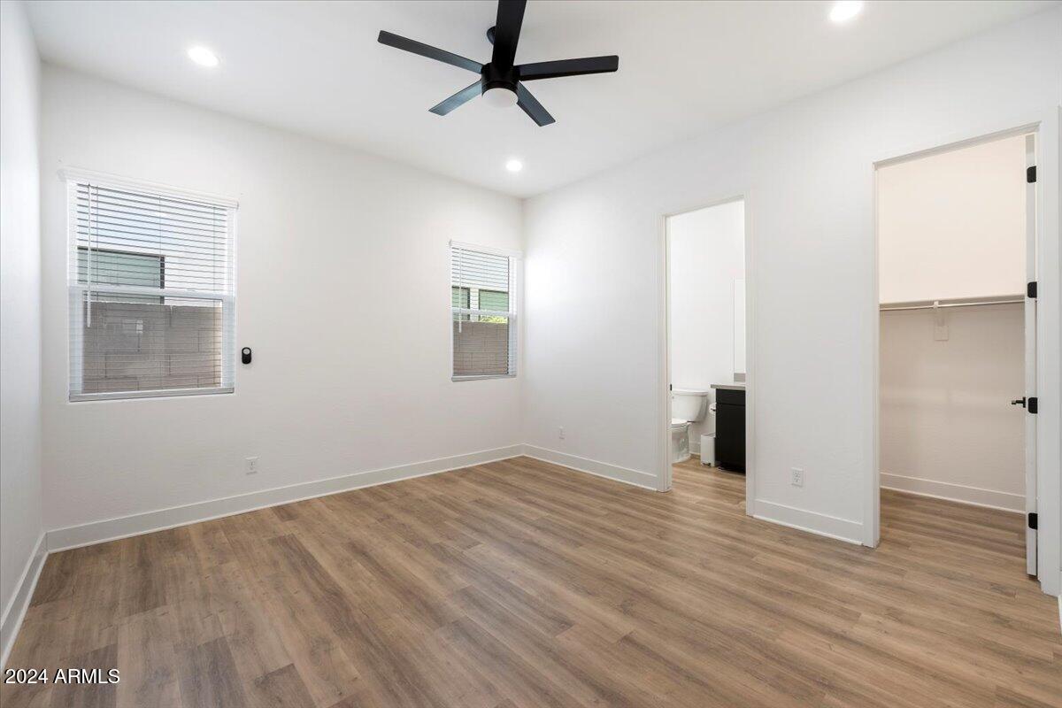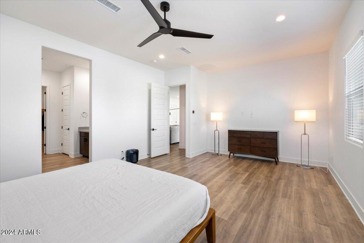 The primary suite serves as a tranquil retreat with a spa-like bathroom, complete with dual sinks, a walk-in closet, and a linen closet. Each bathroom throughout the home, including the ensuite bath in an additional bedroom and the main bath, features quartz countertops, ensuring a cohesive, elegant design in every space.