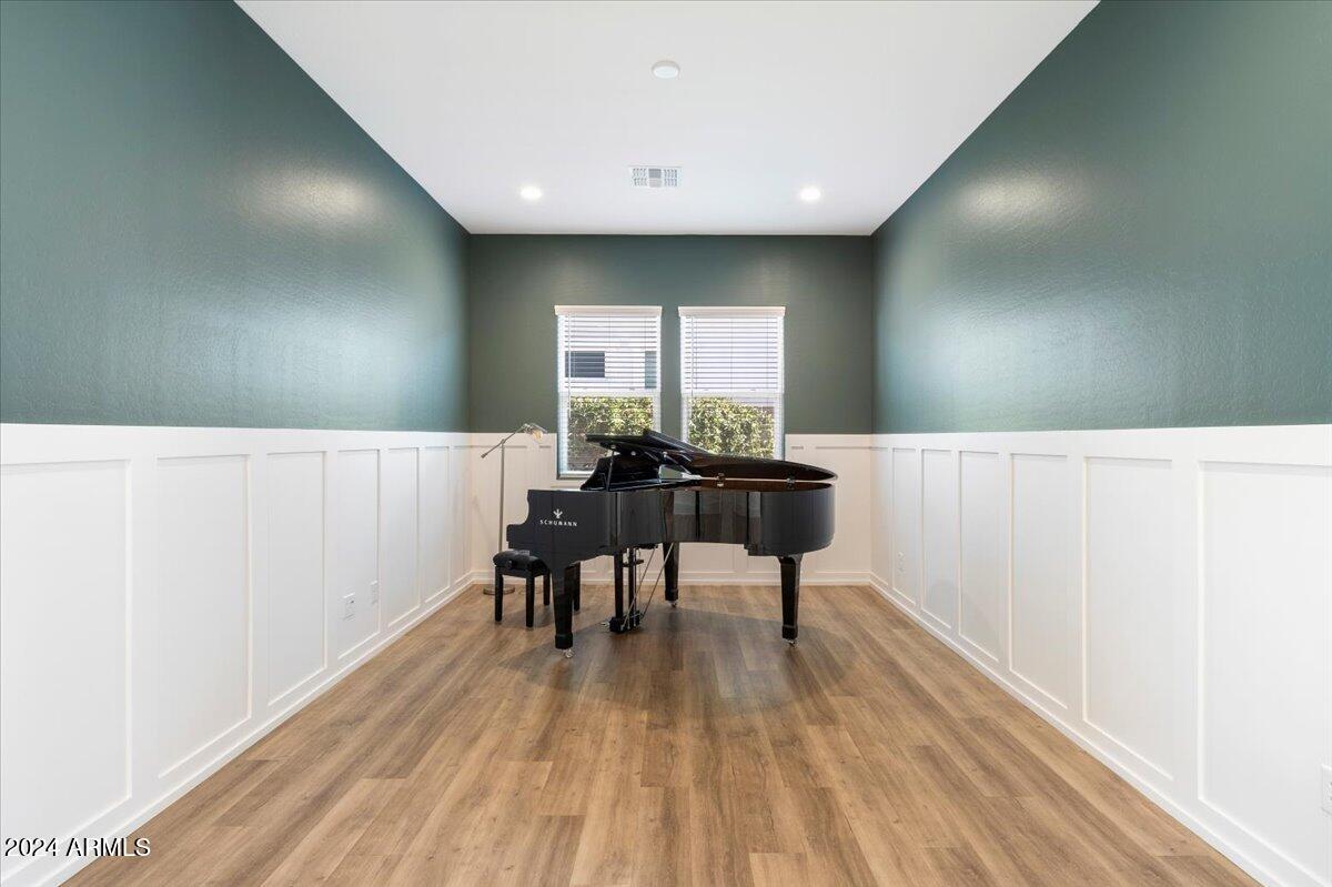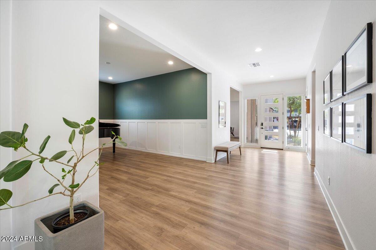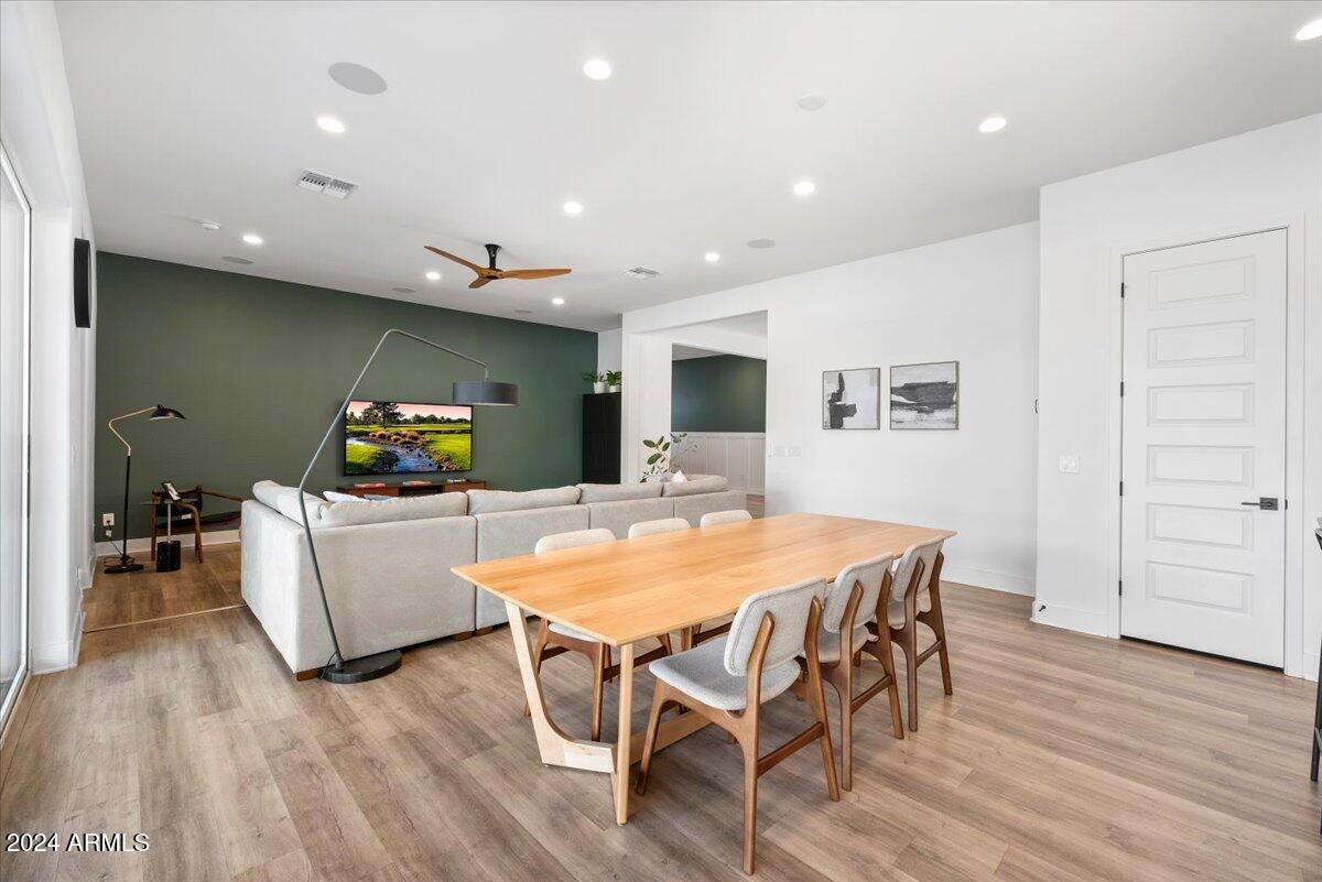 A distinctive flex space with classic wainscoting offers versatility as either a formal dining room or library, catering to various lifestyle needs.