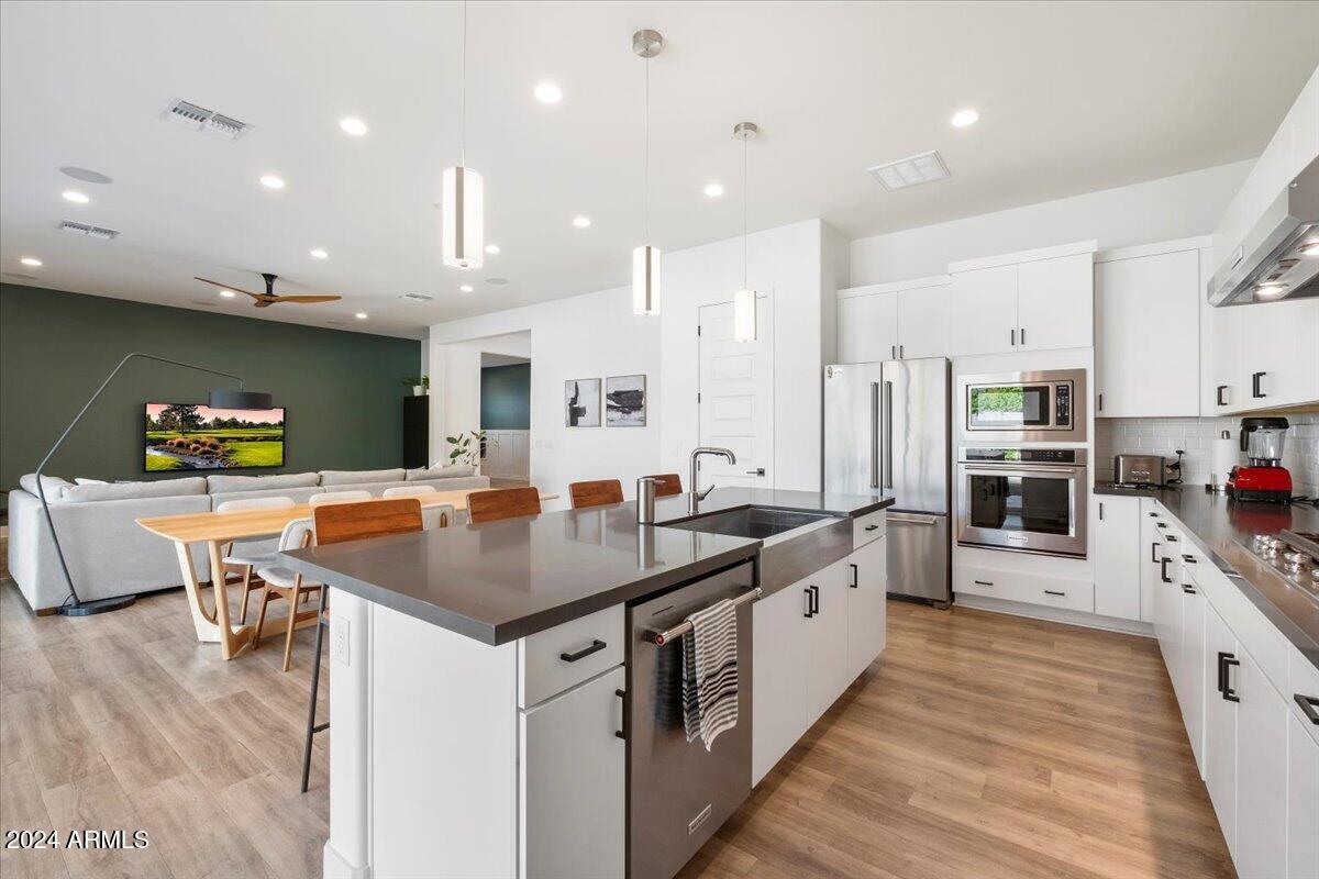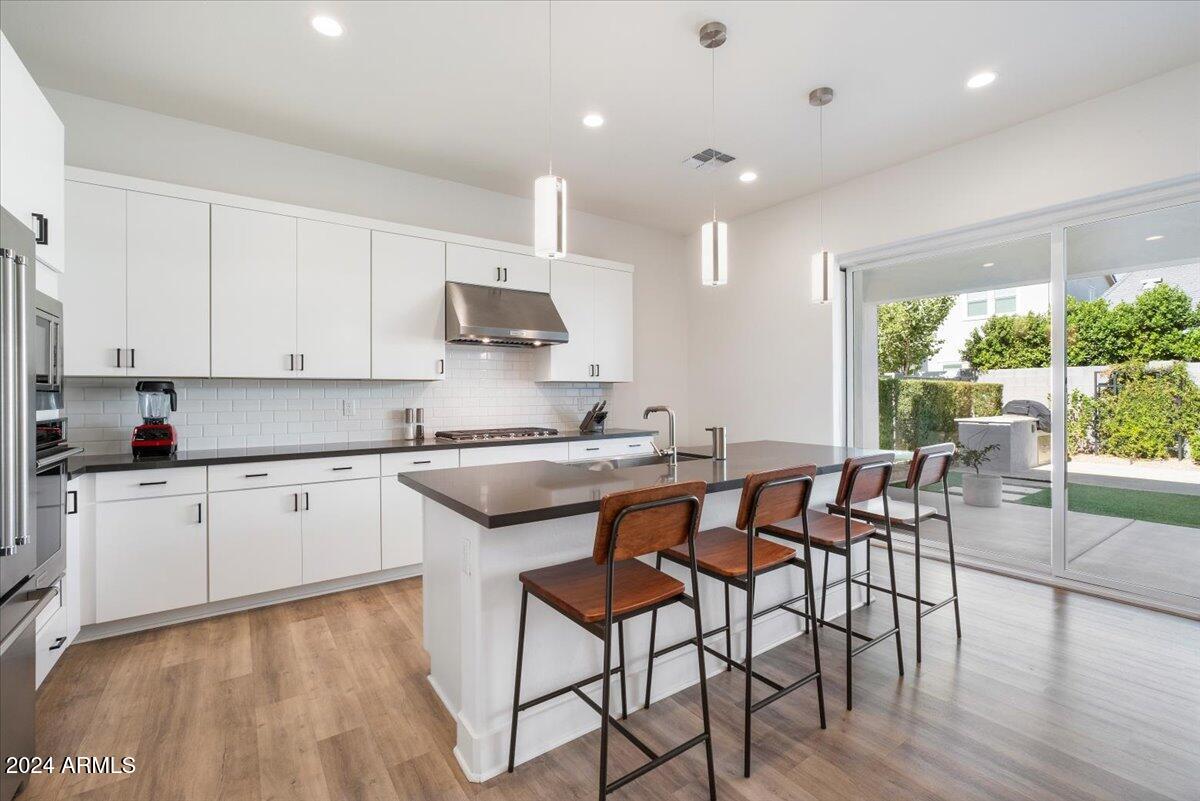 At the heart of the home is a chef-inspired kitchen with a spacious island and sleek quartz countertops, enhanced by stylish pendant lighting. A large pantry and ample cabinetry provide all the storage you need, making this kitchen both highly functional and perfect for entertaining.