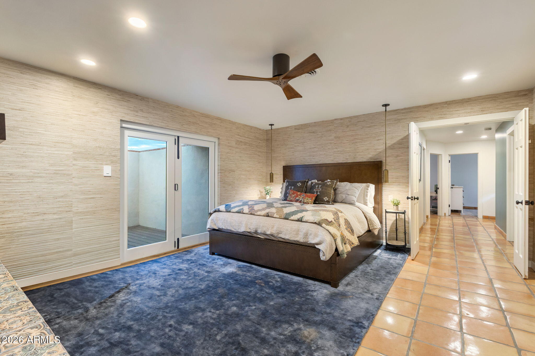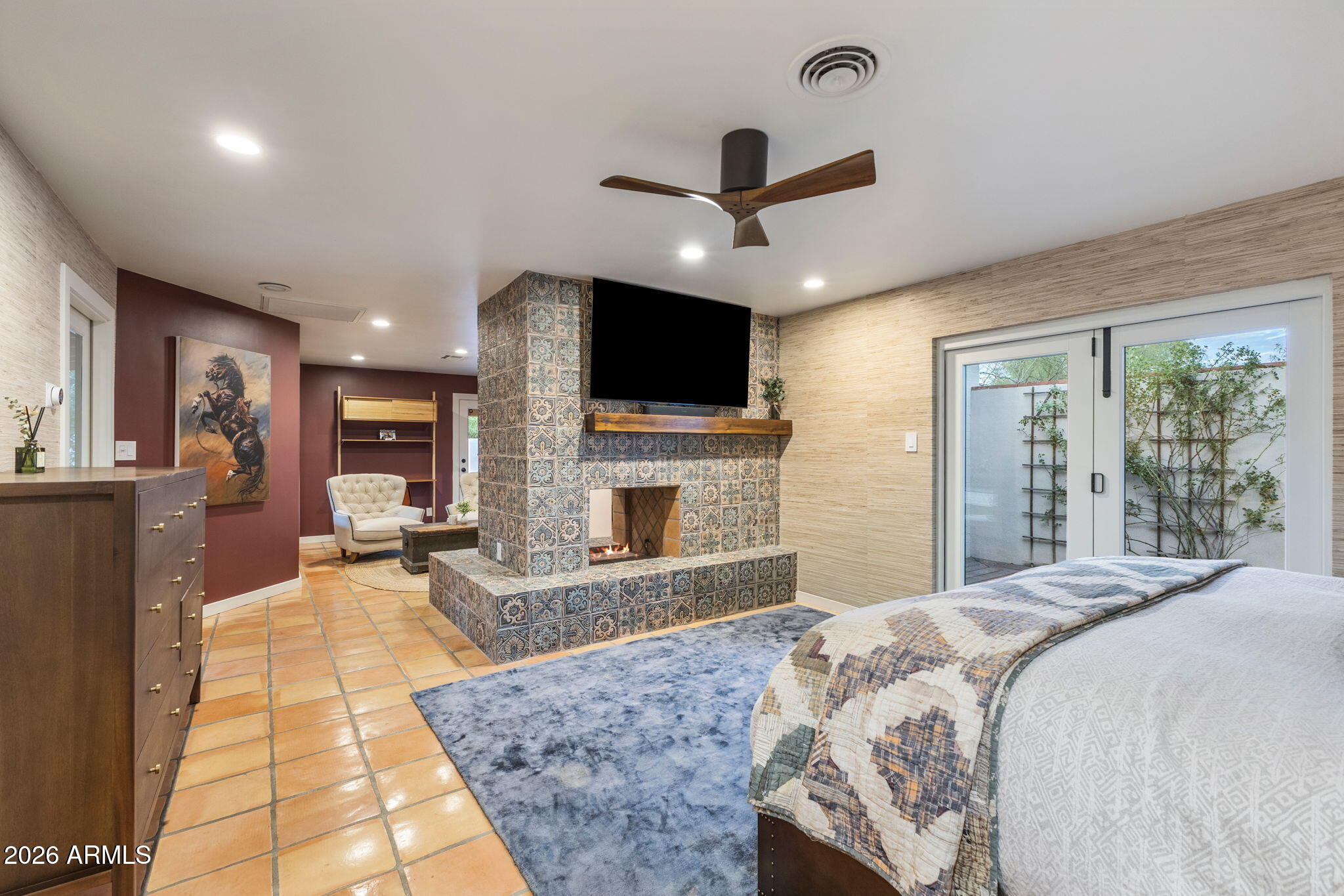 The primary suite includes a fireplace, sitting area, in-suite laundry, custom shoe closets, dual vanities, soaking tub, sauna, outdoor shower, and private patio access.