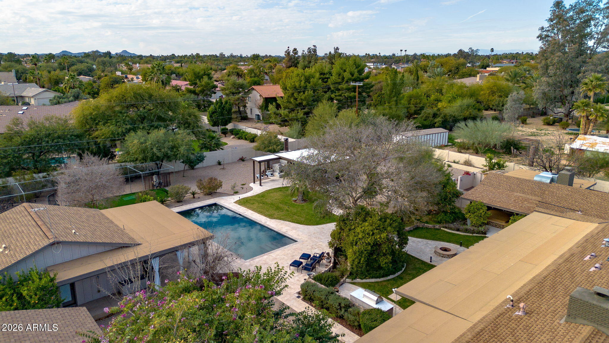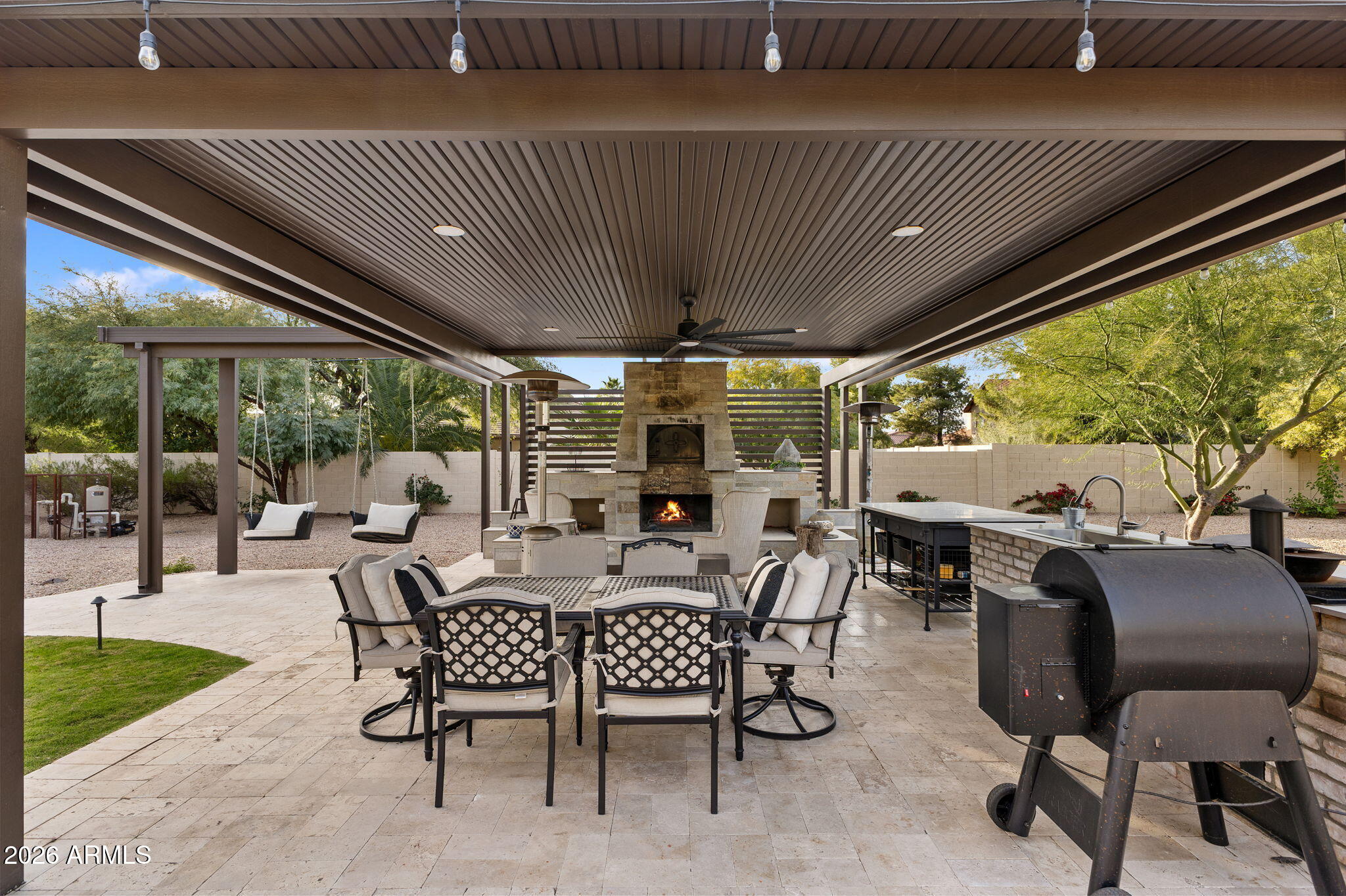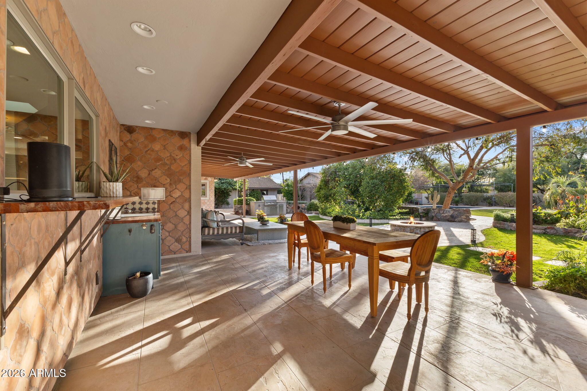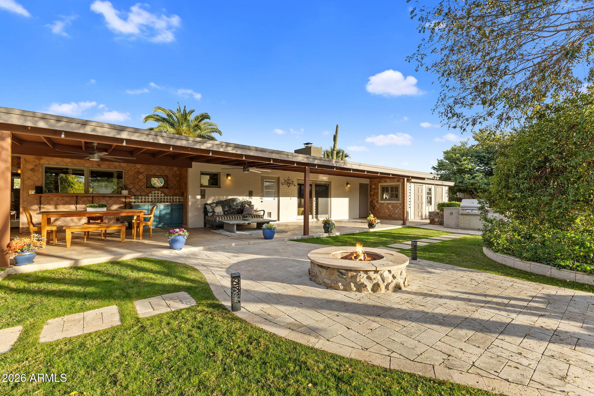 The backyard is designed for outdoor living with a pool, spa, sauna, covered patios, built-in barbecue, fire pit, wood fired pizza oven, wood fired wok, raised garden beds, and mature citrus and fruit trees.