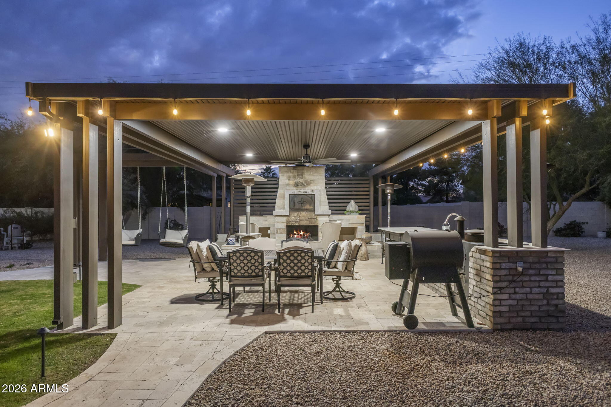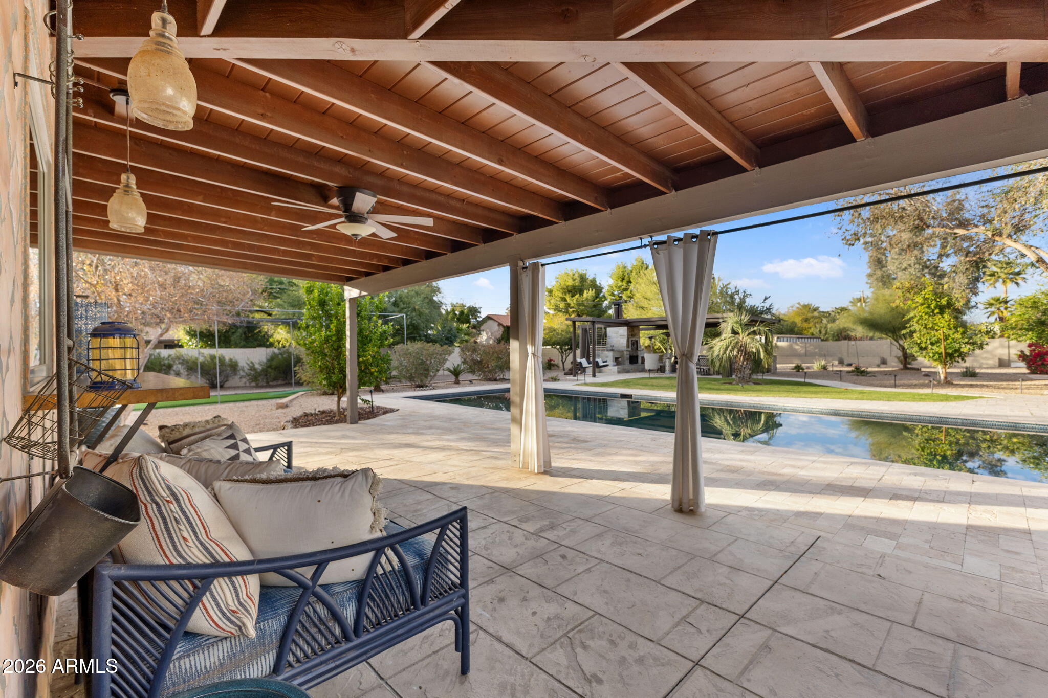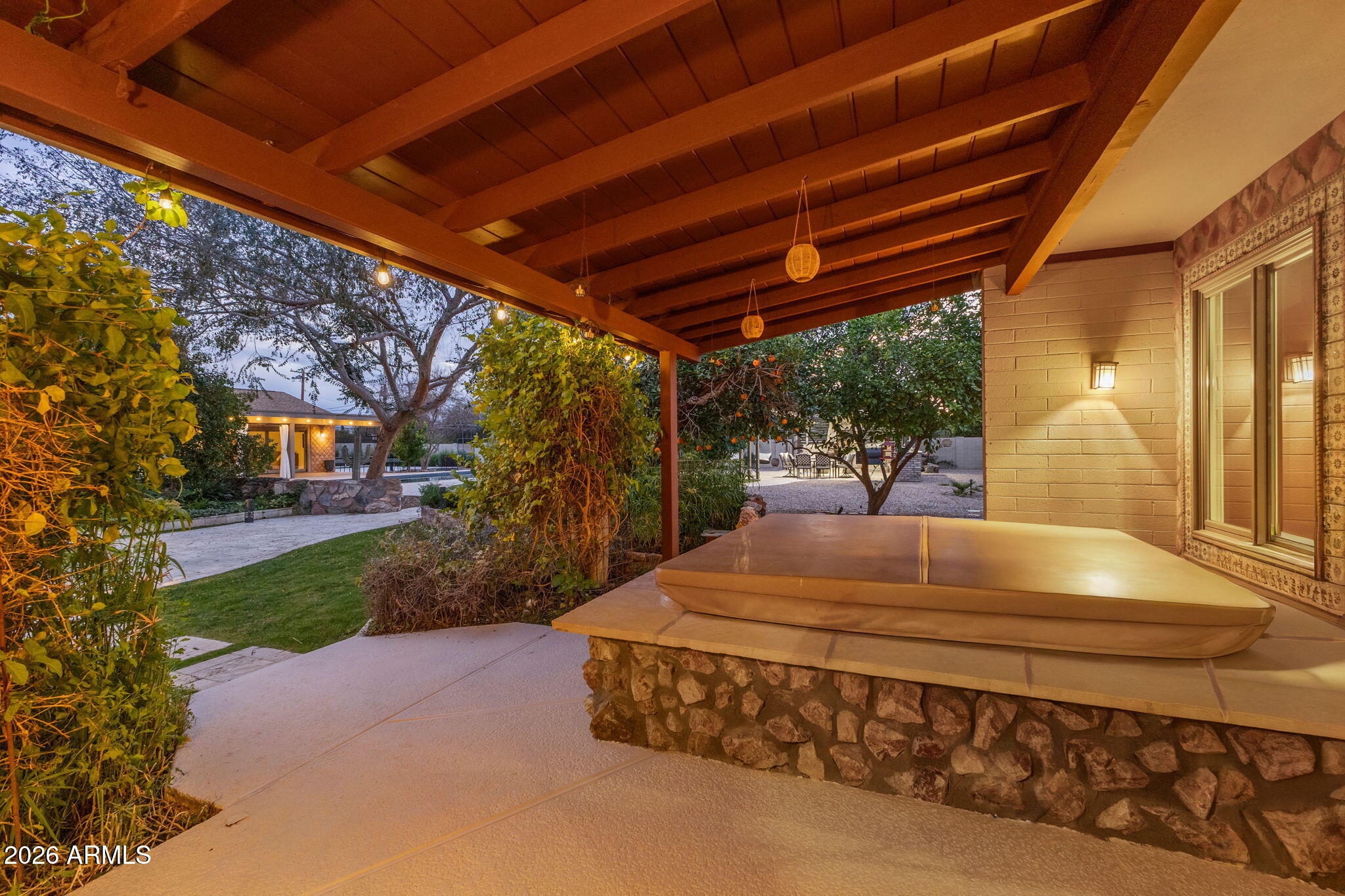 The backyard is designed for outdoor living with a pool, spa, sauna, covered patios, built-in barbecue, fire pit, wood fired pizza oven, wood fired wok, raised garden beds, and mature citrus and fruit trees.