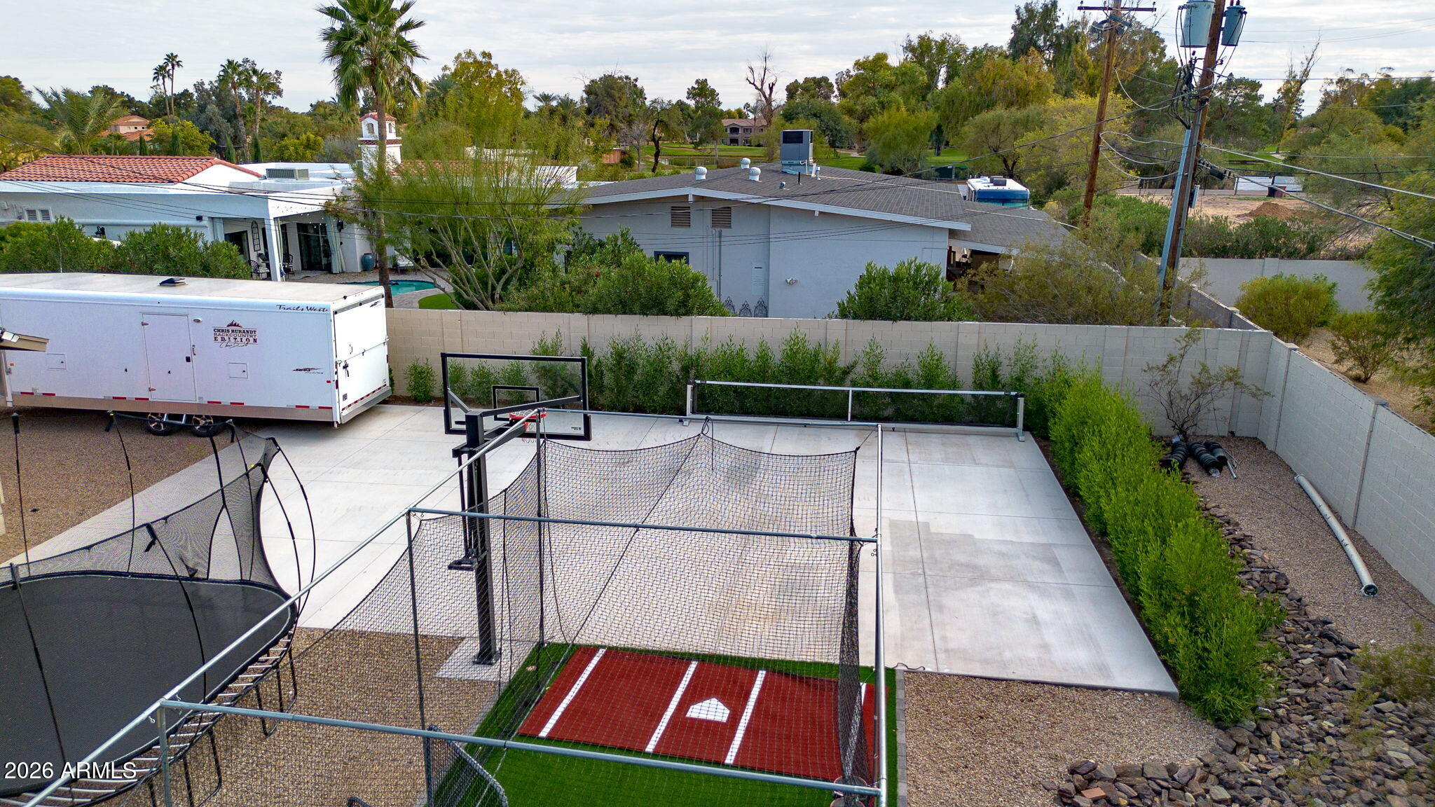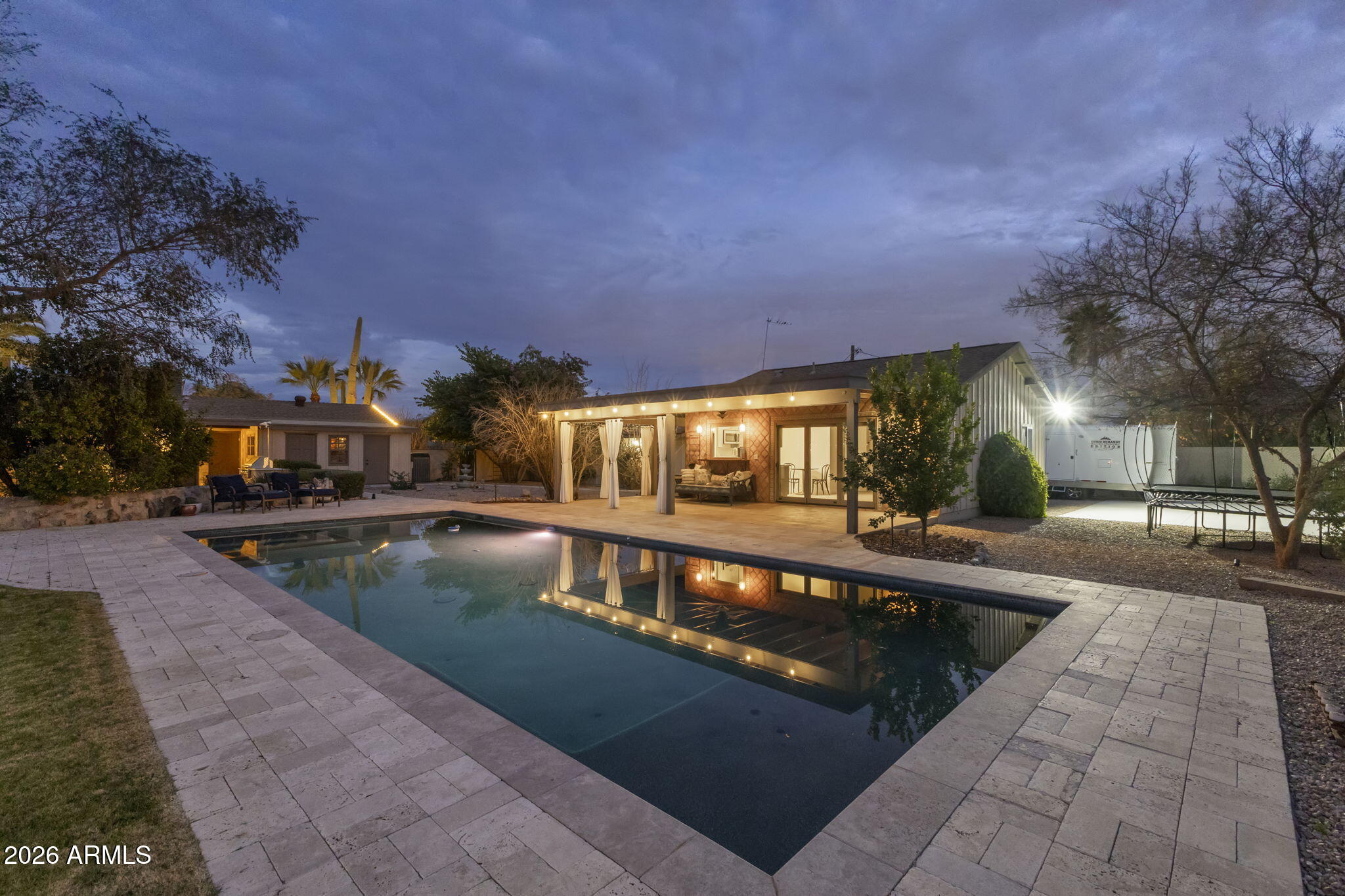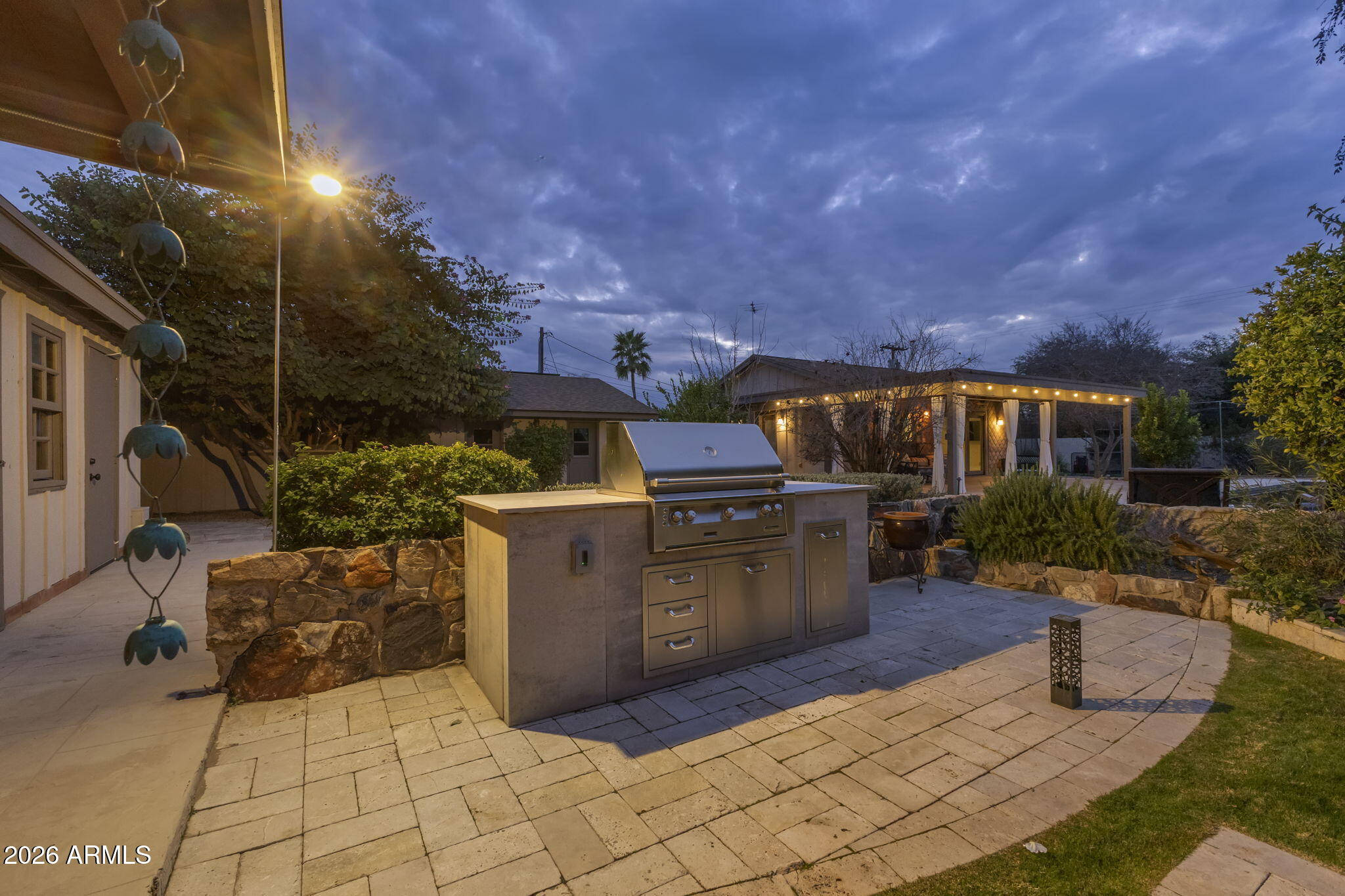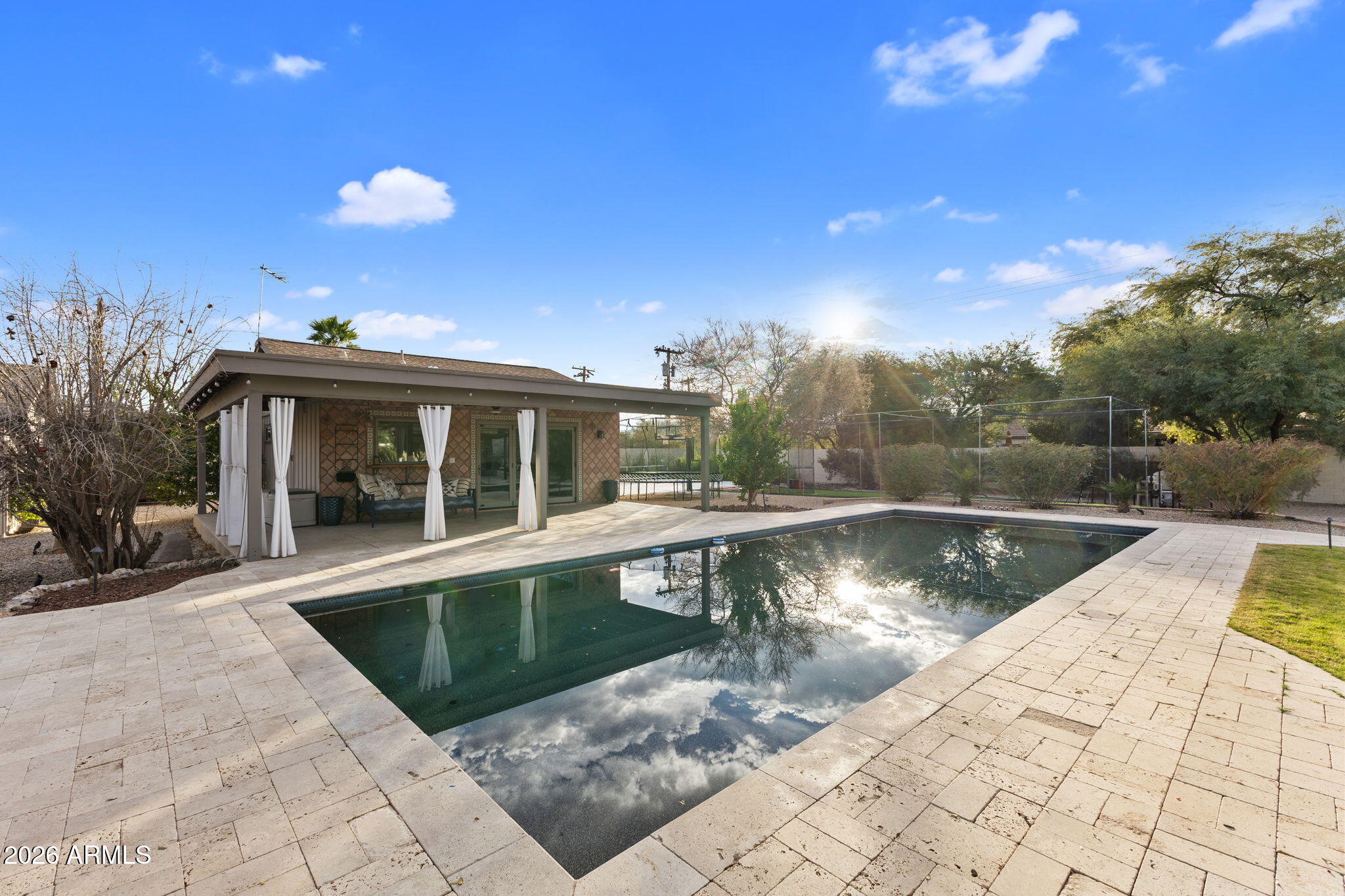 The backyard is designed for outdoor living with a pool, spa, sauna, covered patios, built-in barbecue, fire pit, wood fired pizza oven, wood fired wok, raised garden beds, and mature citrus and fruit trees.