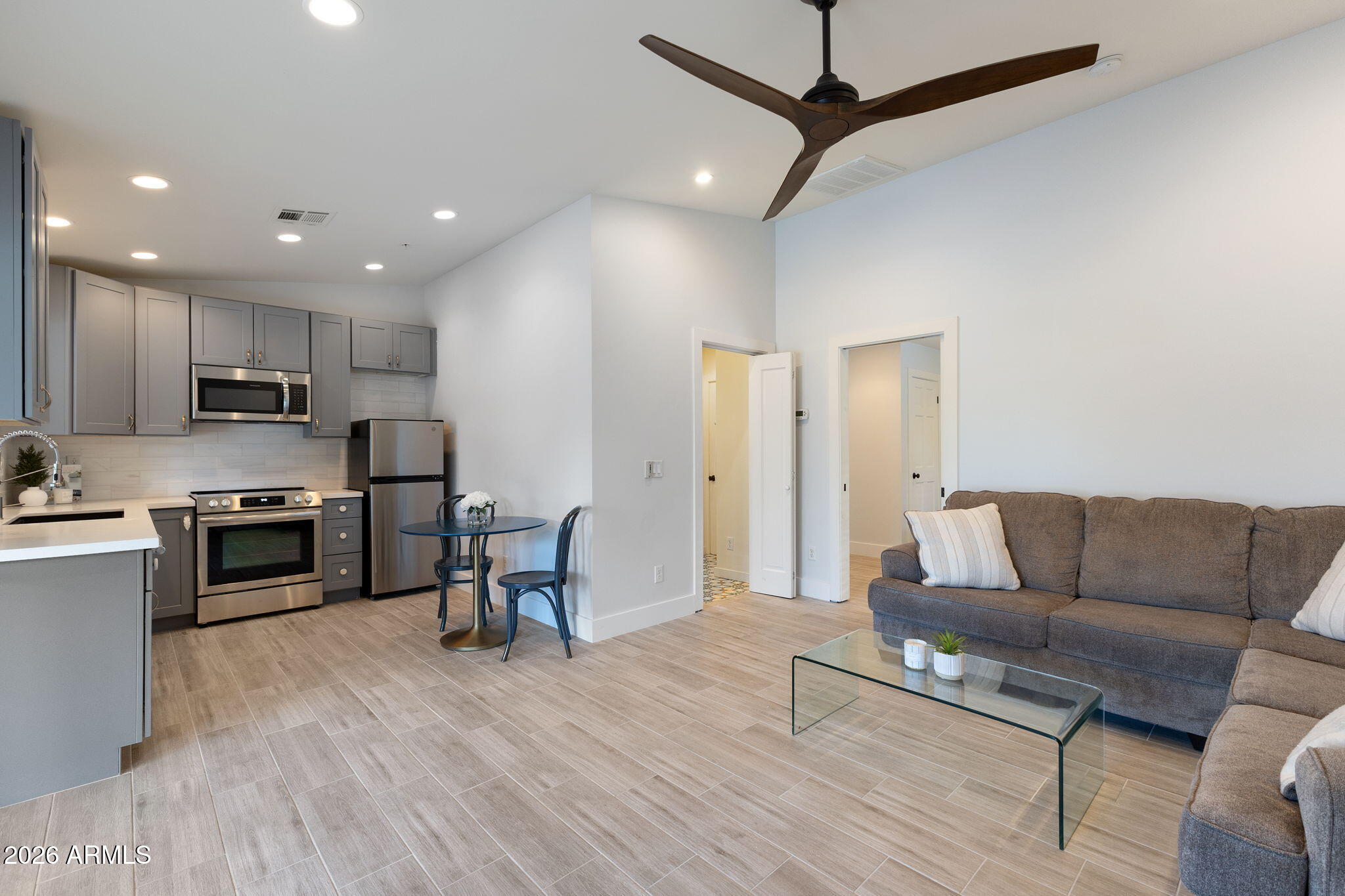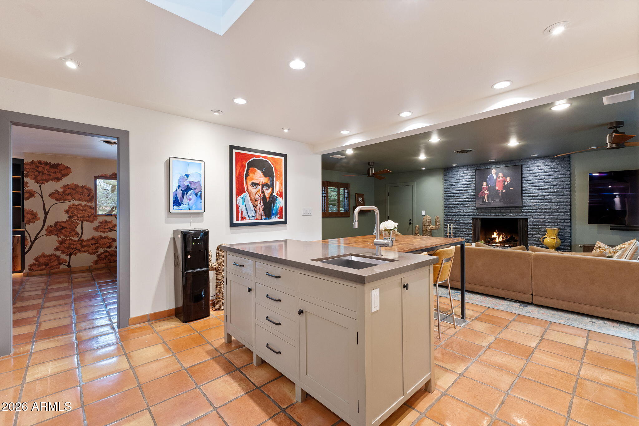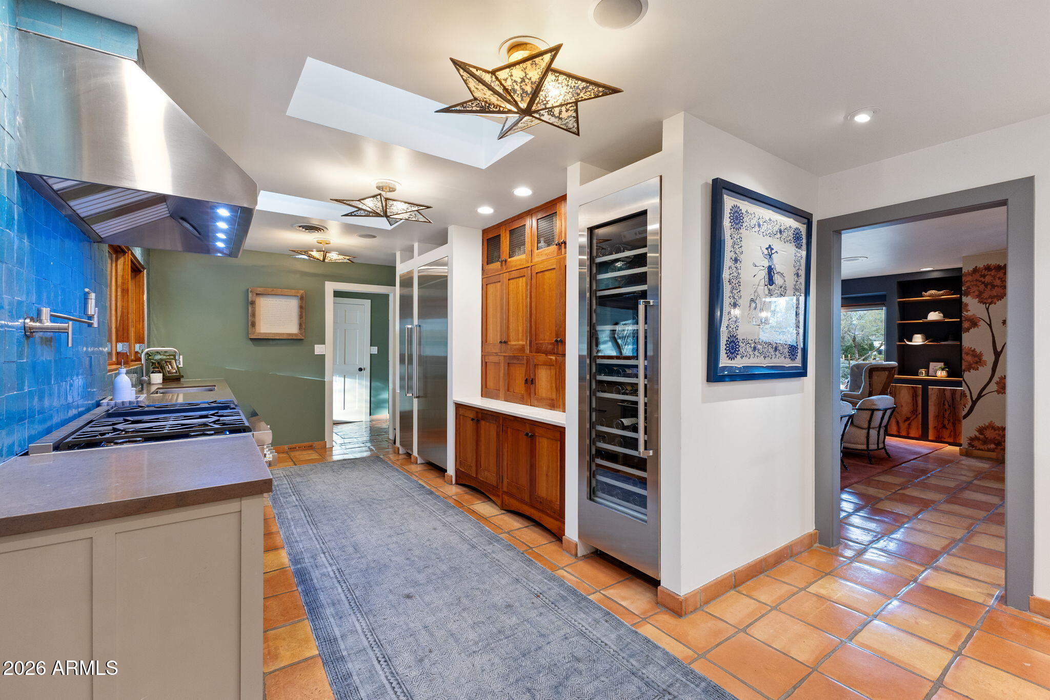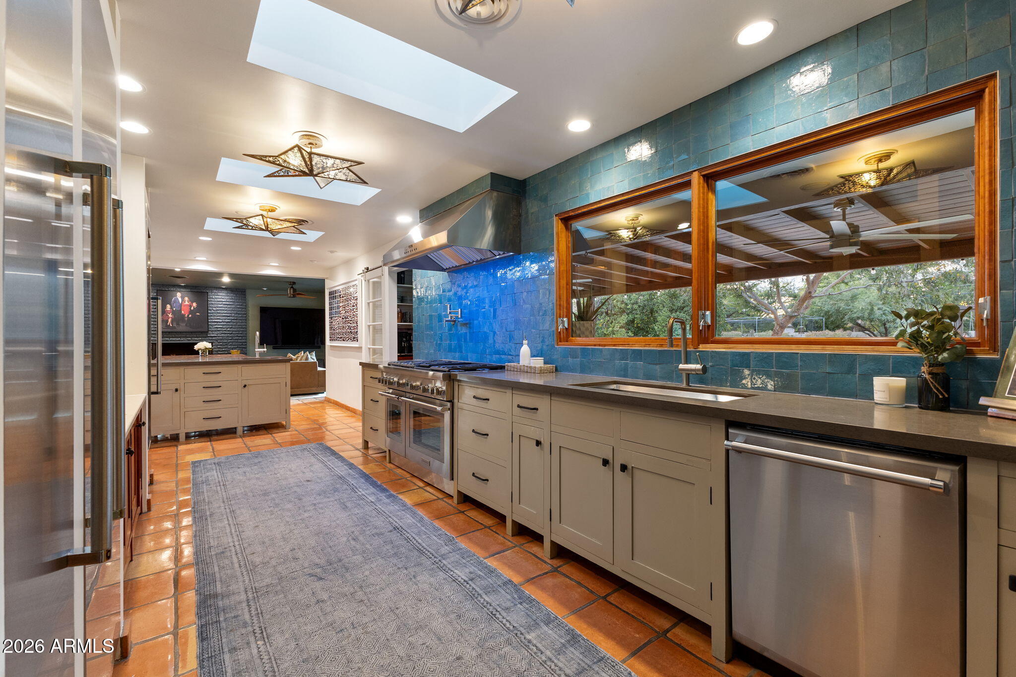 The main residence offers approximately 2,973 square feet with 3 bedrooms and 2.5 bathrooms, complemented by a 682 square foot guest house built in 2016 with kitchen, living area, bedroom, and bathroom. Ideal for guests, extended family, or a private office. The kitchen features a 48-inch Thermador gas range with dual ovens, pot filler, veggie sink, wine fridge, and open flow to the family room.