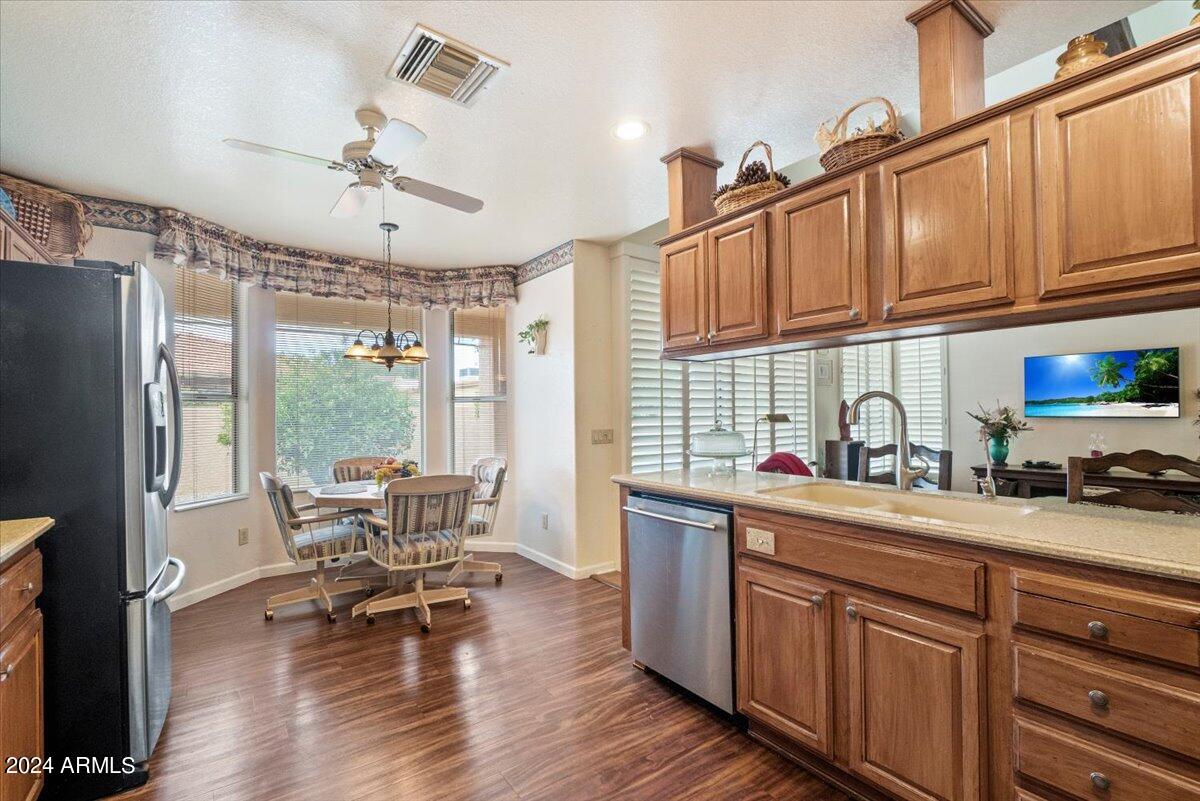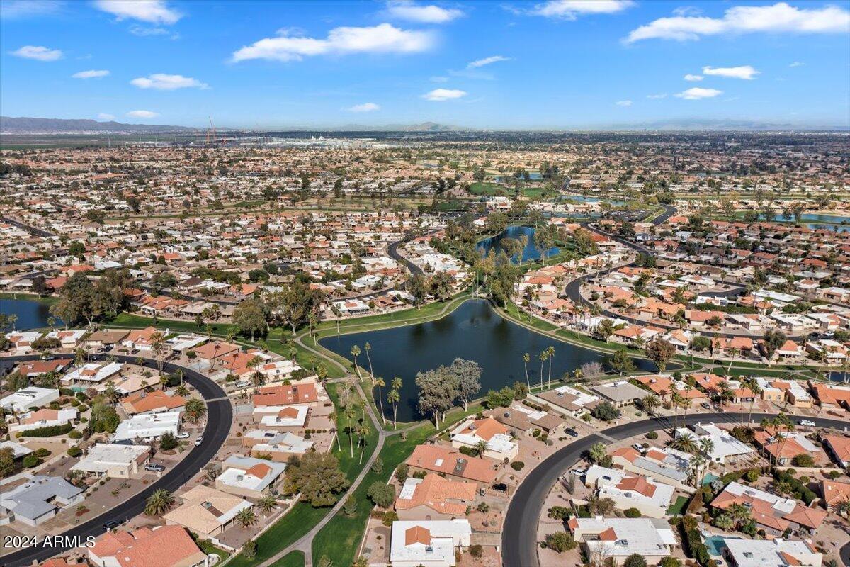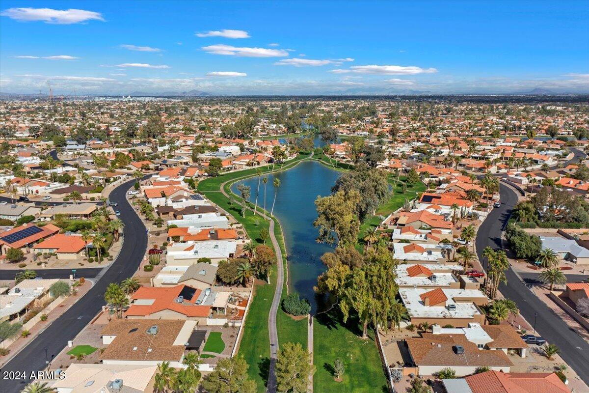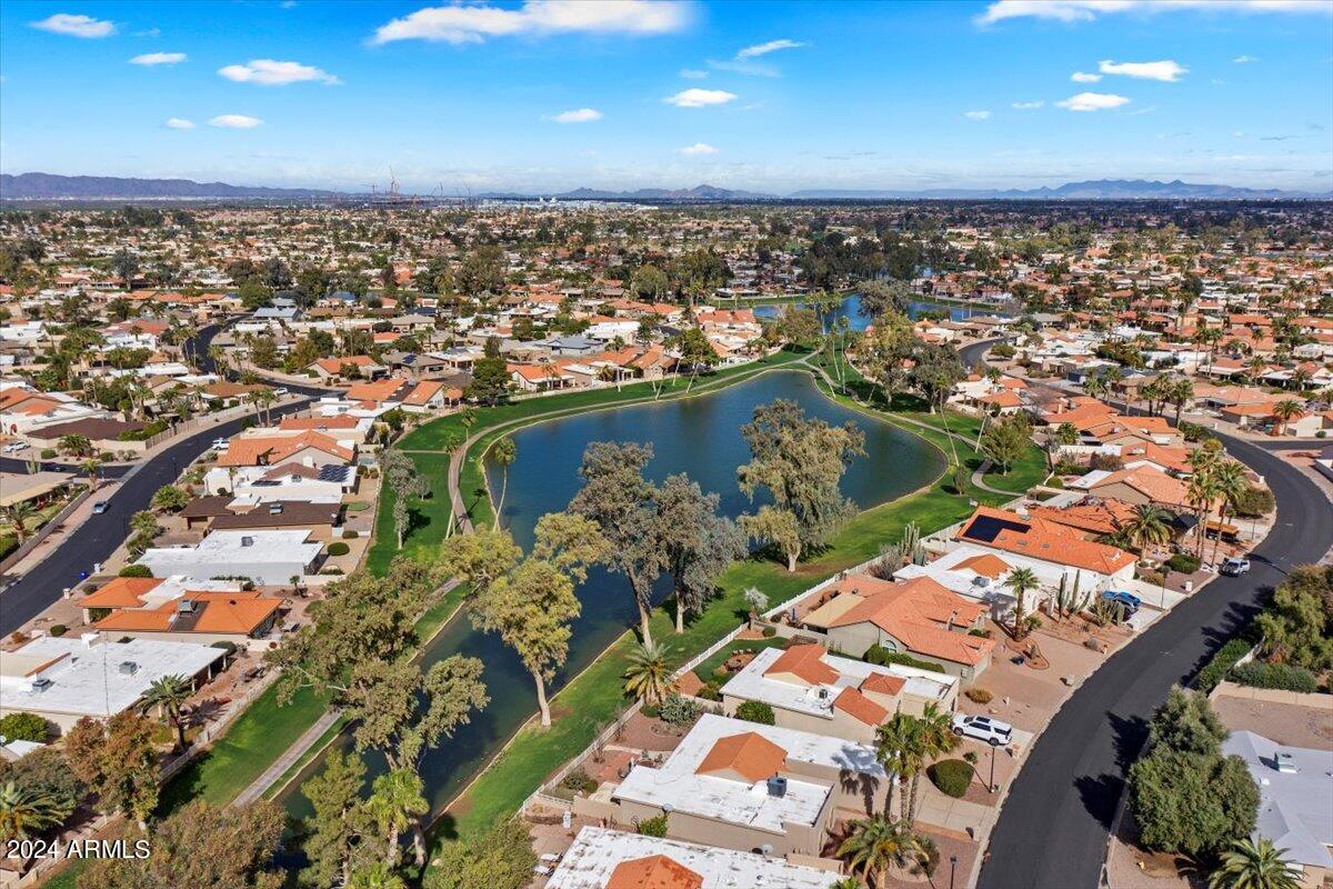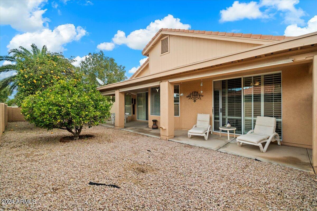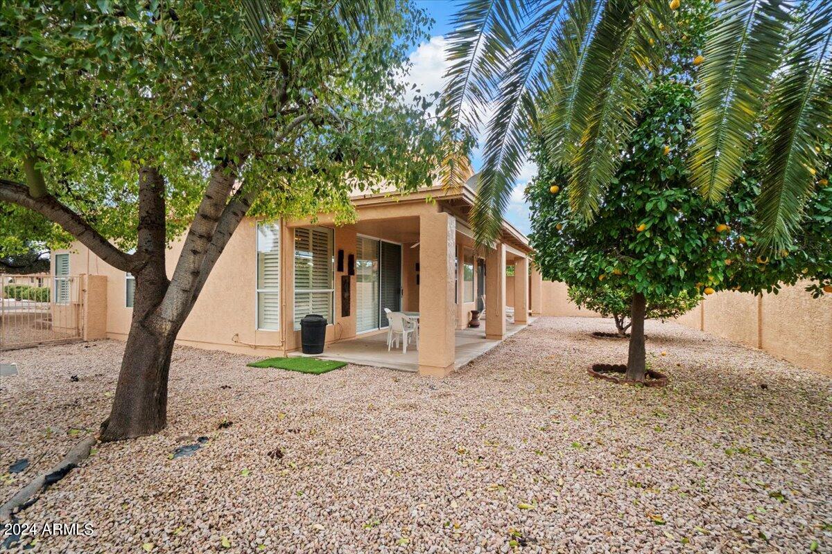 Welcome to this light filled and spacious two bedroom, two bath, popular Ventura model home in the heart of Sun Lakes, an active adult community. Located in Cottonwood, this home has access to all the amenities a resort lifestyle has to offer, including golf, tennis, Pickleball, pools/spa, fitness center, clubhouse and restaurants. This newly painted home has lovely curb appeal with a expansive paver driveway, paver pathway to a double door entry and mature trees in the front yard. The interior includes custom shutters, vaulted ceilings, and skylights throughout much of the home. The upgraded kitchen with stainless steel appliances has built in desk, eat in dining area and counter seating. The home's floorplan includes a family room off the kitchen and a spacious dining room and living room, perfect for entertaining family and friends. Double sliding doors off both the family room and the primary bedroom offer access to the backyard's covered patio that spans the entire back of the home. The primary bedroom boasts a private en suite with walk-in closet and dual sinks. The second bedroom includes a built-in Murphy bed, so the space can easily serve as a guestroom and/or office. The laundry room includes separate laundry sink and brand new washer and dryer. The easy maintenance backyard and spacious side yard includes mature grapefruit, orange and palm trees. The garage includes built-in storage and a golf cart garage.