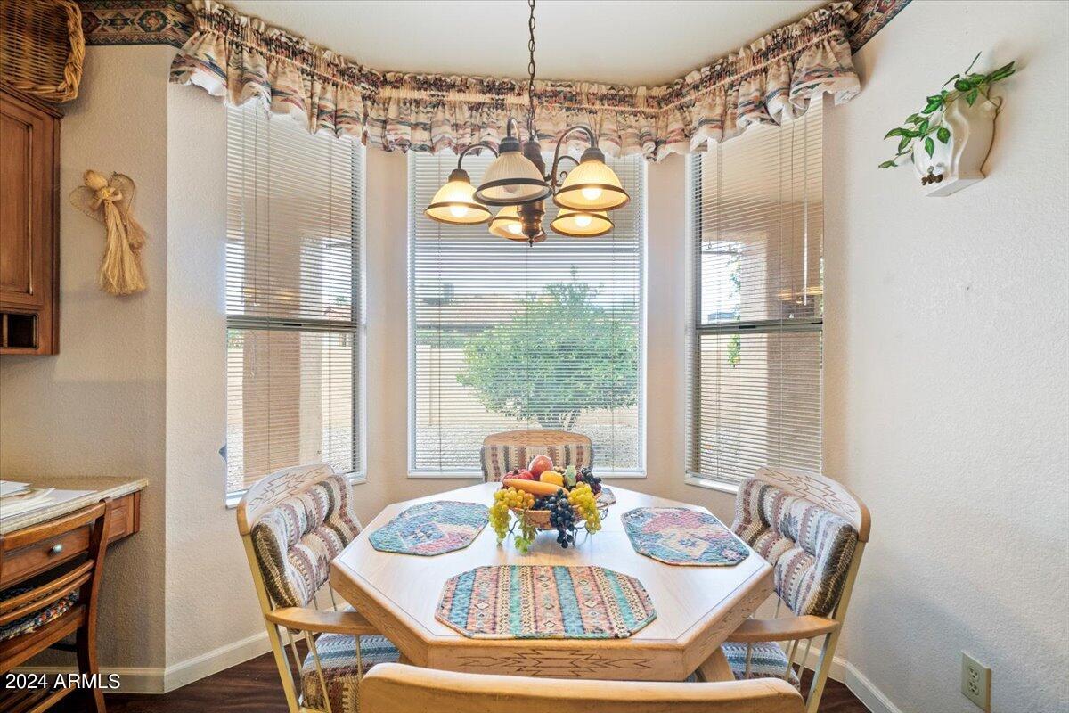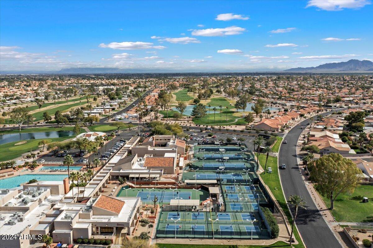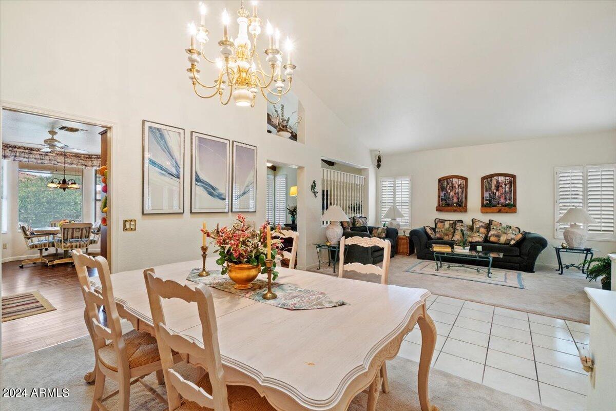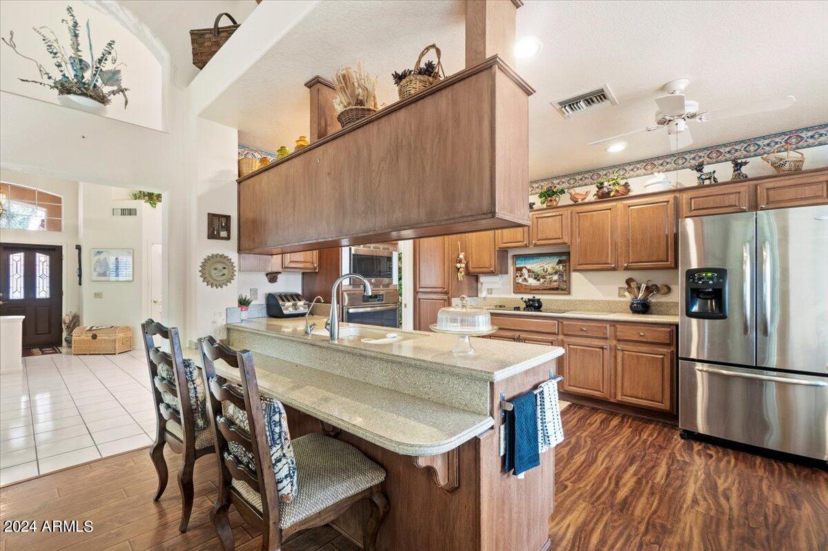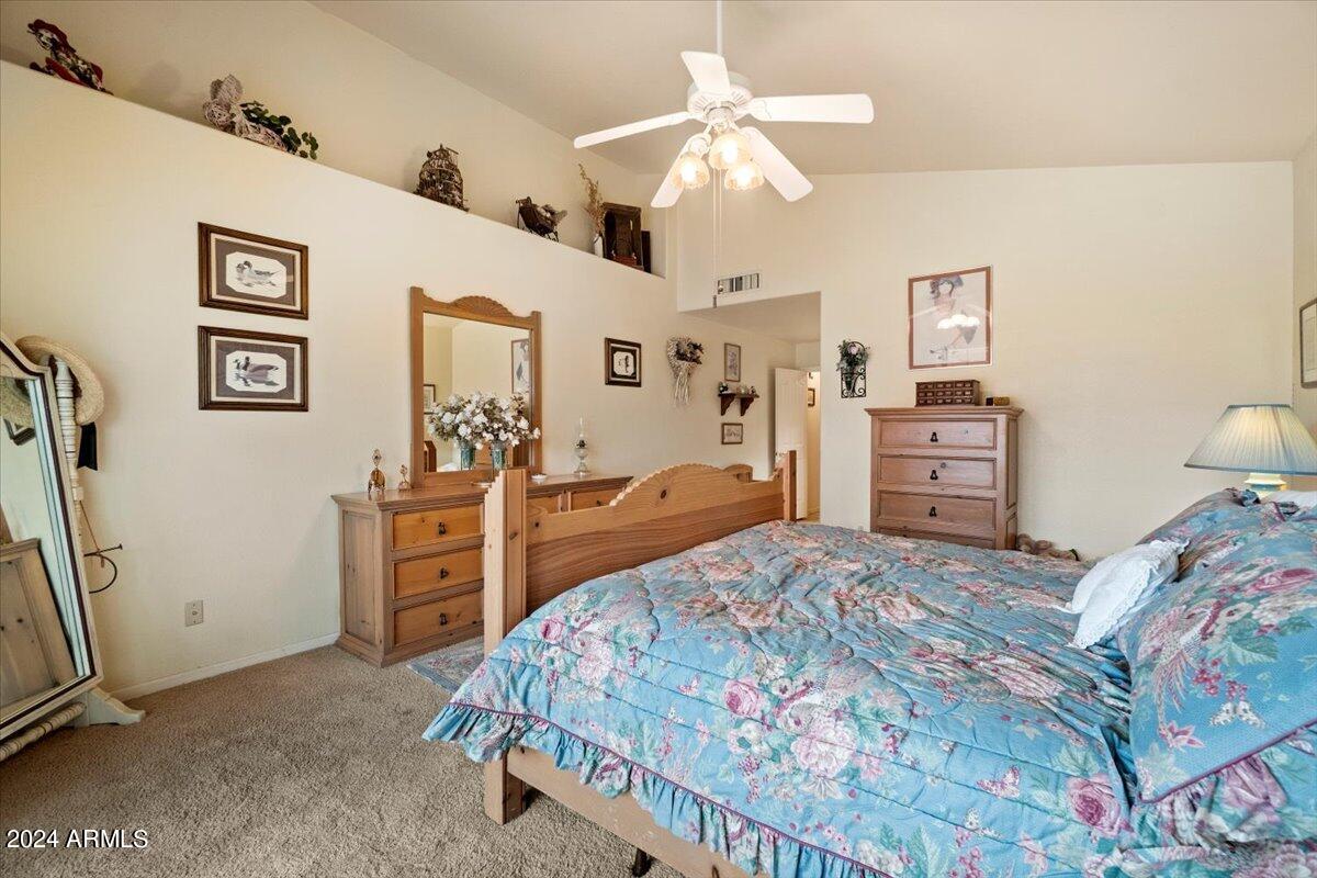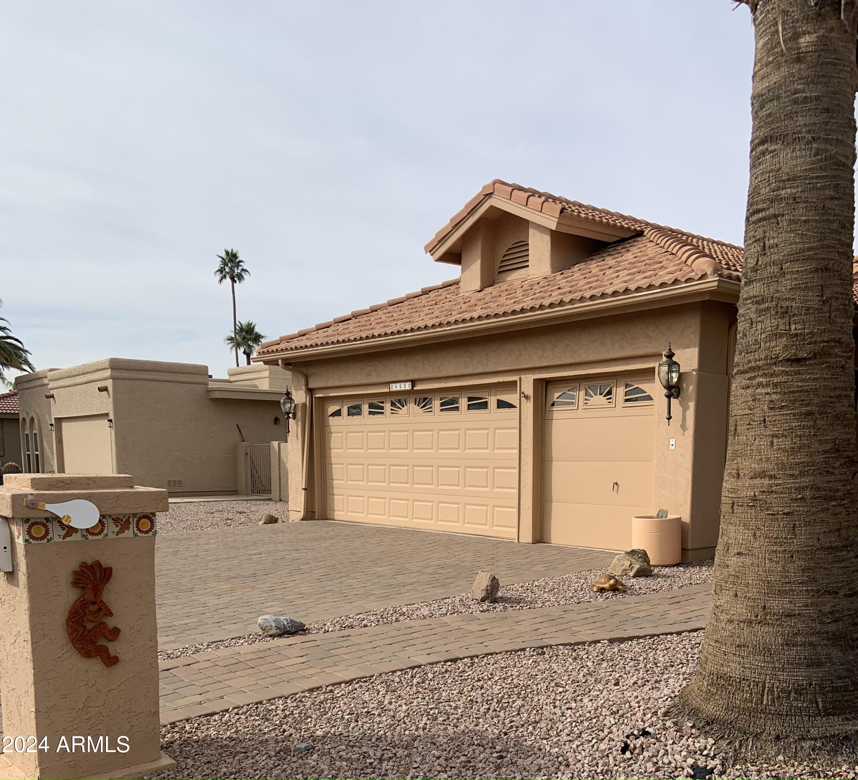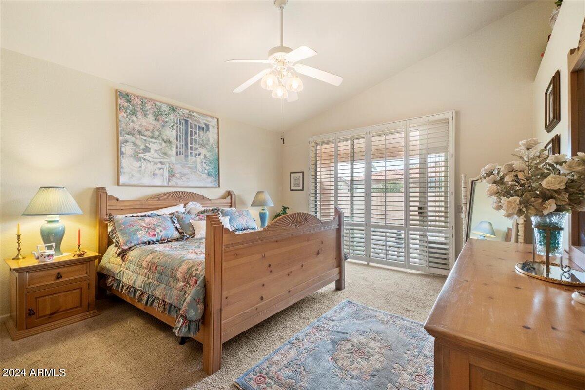 Welcome to this light filled and spacious two bedroom, two bath, popular Ventura model home in the heart of Sun Lakes, an active adult community. Located in Cottonwood, this home has access to all the amenities a resort lifestyle has to offer, including golf, tennis, Pickleball, pools/spa, fitness center, clubhouse and restaurants. This newly painted home has lovely curb appeal with a expansive paver driveway, paver pathway to a double door entry and mature trees in the front yard. The interior includes custom shutters, vaulted ceilings, and skylights throughout much of the home. The upgraded kitchen with stainless steel appliances has built in desk, eat in dining area and counter seating. The home's floorplan includes a family room off the kitchen and a spacious dining room and living room, perfect for entertaining family and friends. Double sliding doors off both the family room and the primary bedroom offer access to the backyard's covered patio that spans the entire back of the home. The primary bedroom boasts a private en suite with walk-in closet and dual sinks. The second bedroom includes a built-in Murphy bed, so the space can easily serve as a guestroom and/or office. The laundry room includes separate laundry sink and brand new washer and dryer. The easy maintenance backyard and spacious side yard includes mature grapefruit, orange and palm trees. The garage includes built-in storage and a golf cart garage.