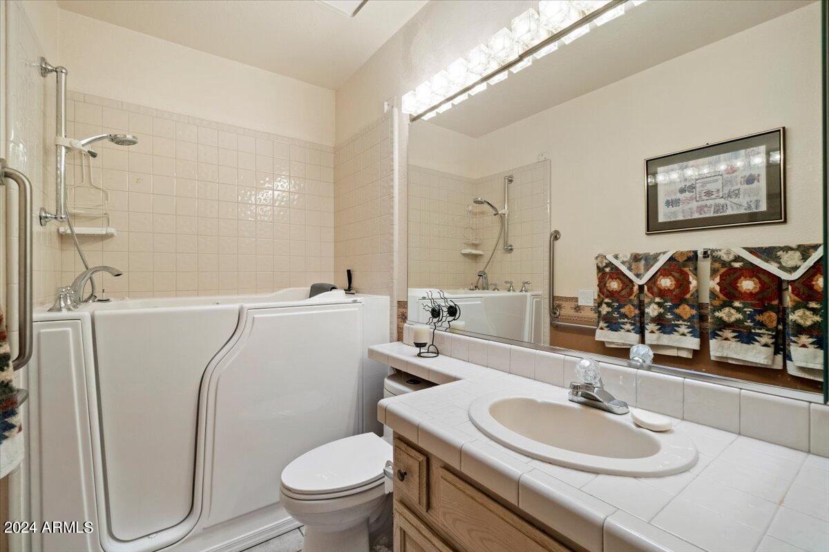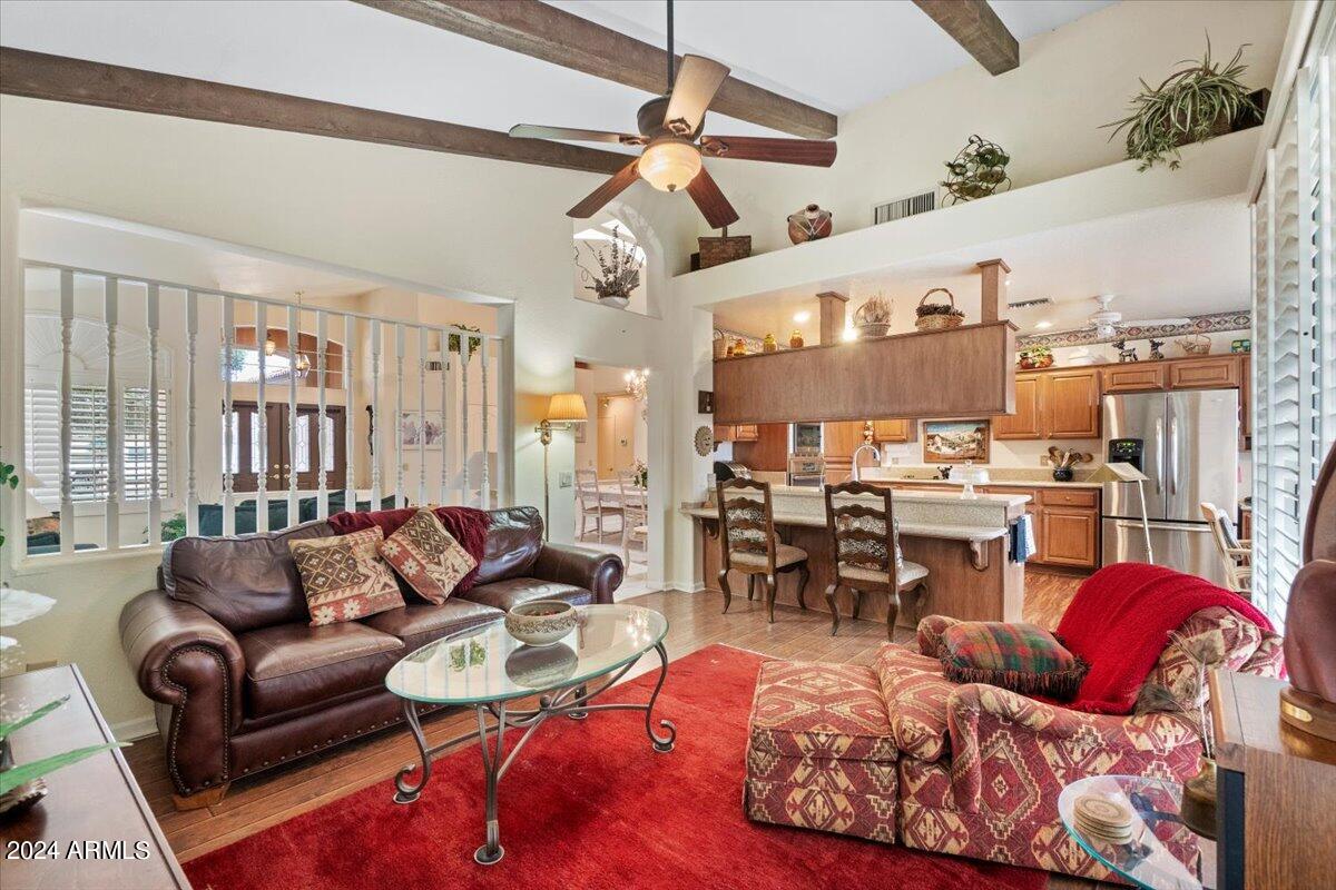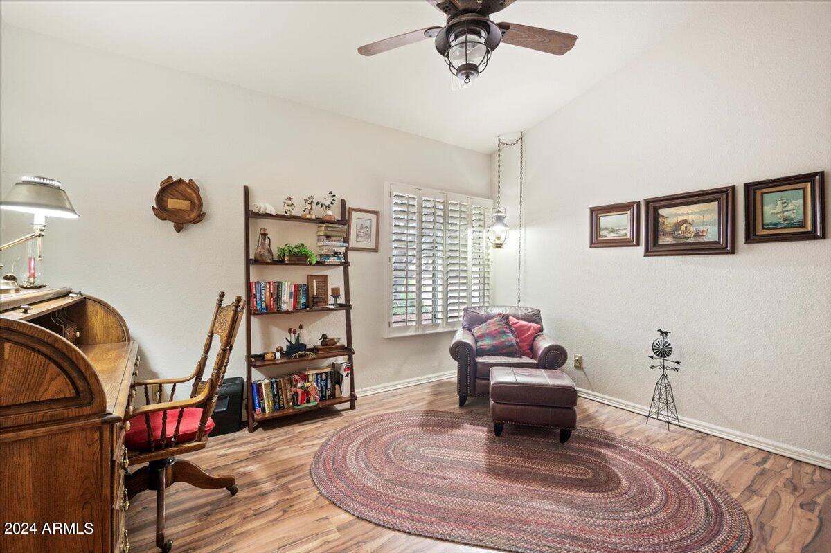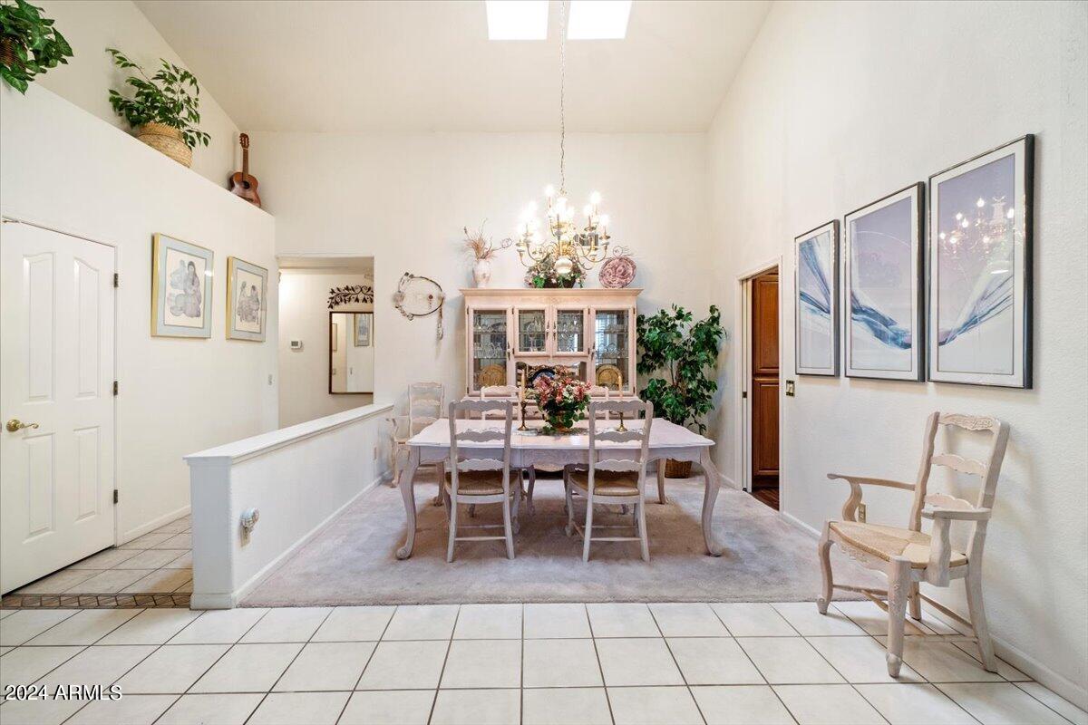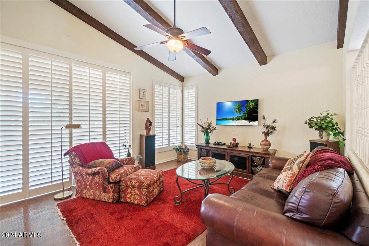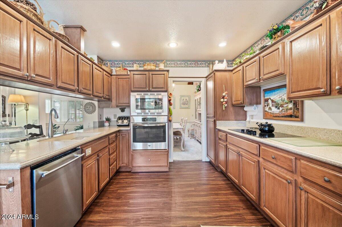 Welcome to this light filled and spacious two bedroom, two bath, popular Ventura model home in the heart of Sun Lakes, an active adult community. Located in Cottonwood, this home has access to all the amenities a resort lifestyle has to offer, including golf, tennis, Pickleball, pools/spa, fitness center, clubhouse and restaurants. This newly painted home has lovely curb appeal with a expansive paver driveway, paver pathway to a double door entry and mature trees in the front yard. The interior includes custom shutters, vaulted ceilings, and skylights throughout much of the home. The upgraded kitchen with stainless steel appliances has built in desk, eat in dining area and counter seating. The home's floorplan includes a family room off the kitchen and a spacious dining room and living room, perfect for entertaining family and friends. Double sliding doors off both the family room and the primary bedroom offer access to the backyard's covered patio that spans the entire back of the home. The primary bedroom boasts a private en suite with walk-in closet and dual sinks. The second bedroom includes a built-in Murphy bed, so the space can easily serve as a guestroom and/or office. The laundry room includes separate laundry sink and brand new washer and dryer. The easy maintenance backyard and spacious side yard includes mature grapefruit, orange and palm trees. The garage includes built-in storage and a golf cart garage.