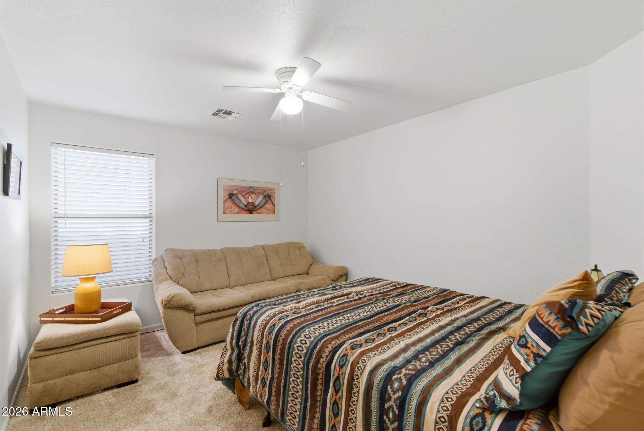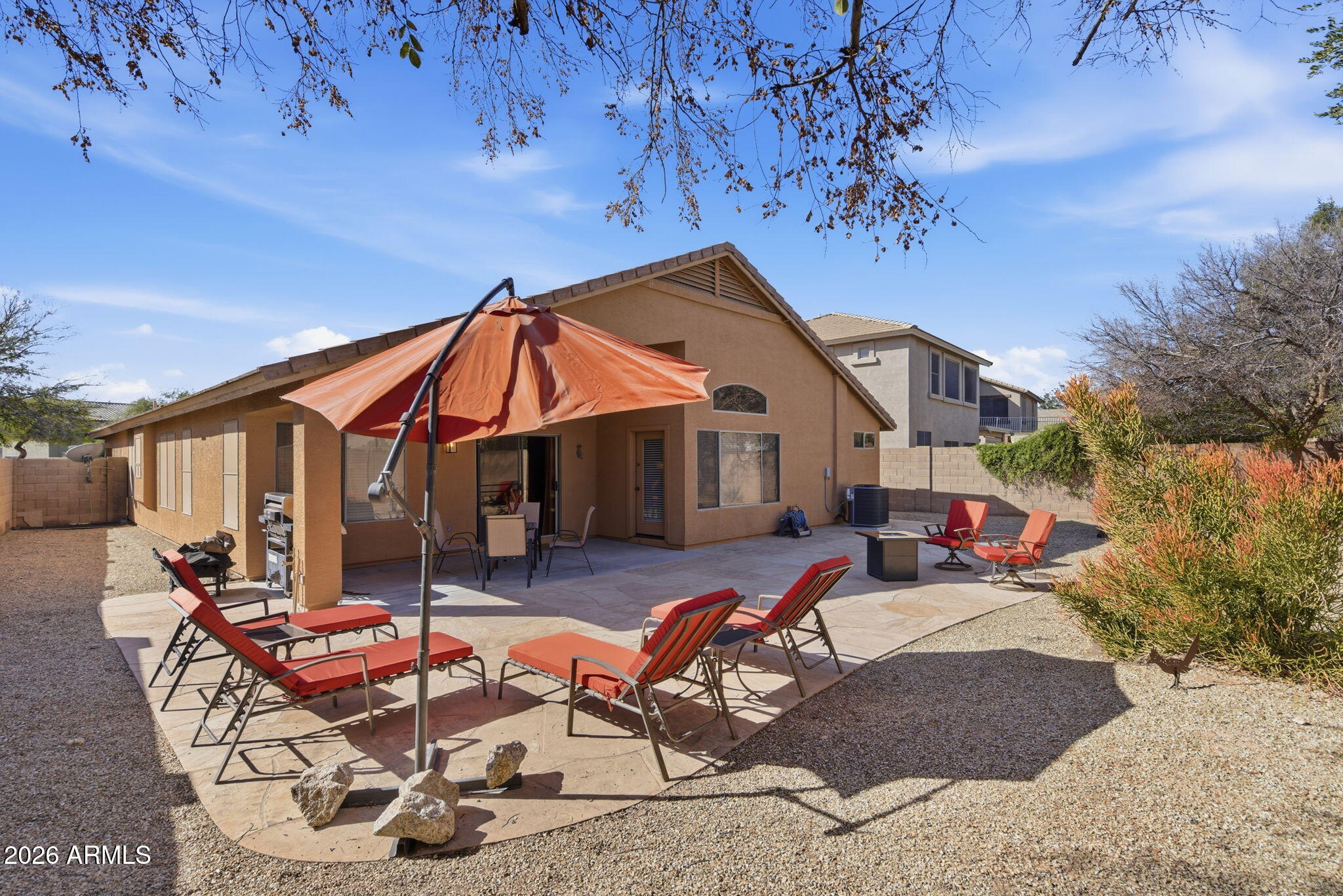 Welcome to this charming 4 bedroom, 2 bathroom home in Johnson Ranch, ideally located directly across from a neighborhood park. The well designed floor plan offers a bright living room with vaulted ceilings that create an open, airy feel. The kitchen features a large walk in pantry, recessed lighting, light countertops, breakfast bar, & a dining area that opens to the family room, making it perfect for everyday living & entertaining. The primary suite includes vaulted ceilings, architectural niches, backyard access, & a full ensuite bath. Enjoy outdoor living with a covered patio, plus a welcoming front porch that adds great curb appeal.