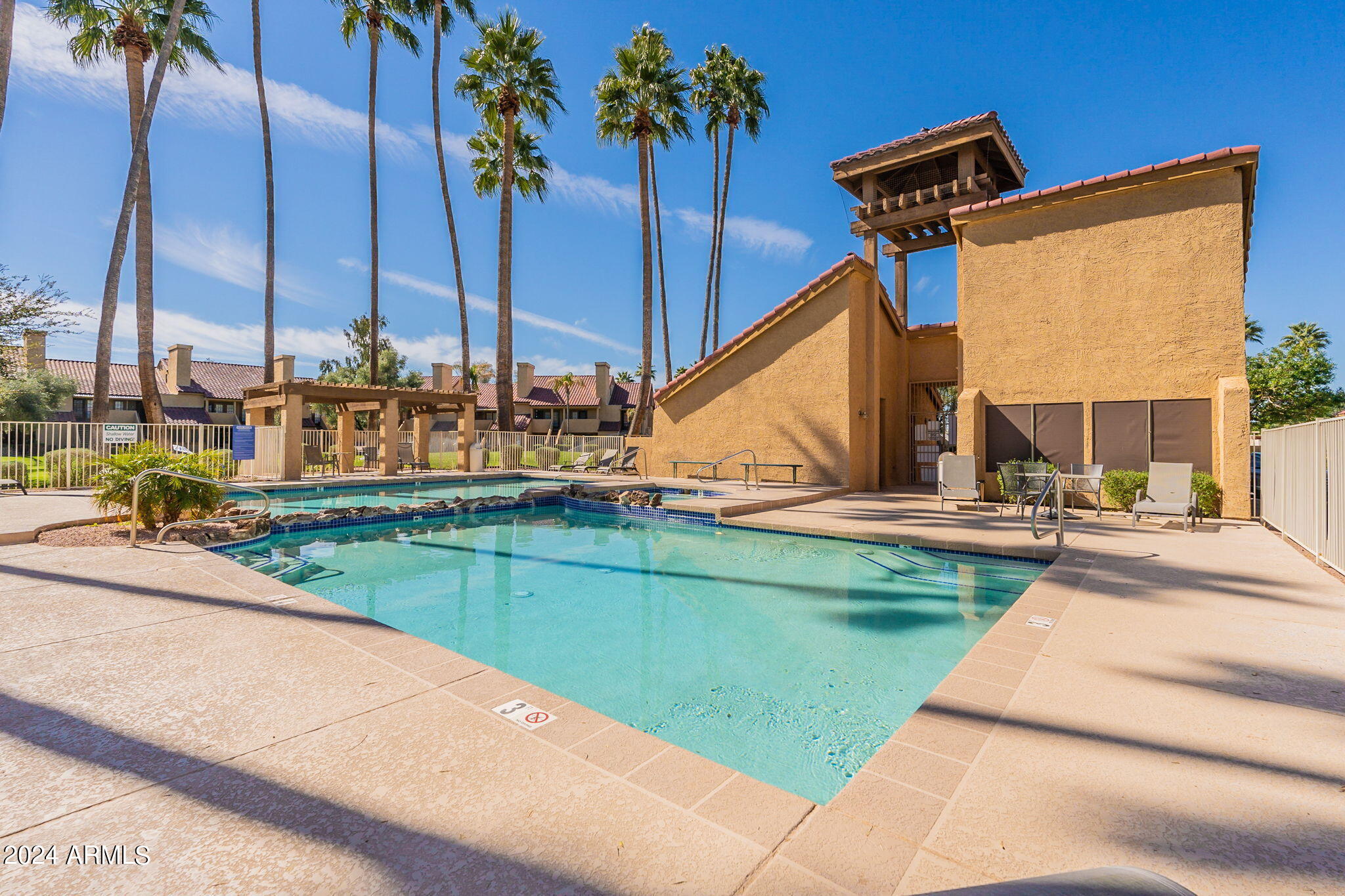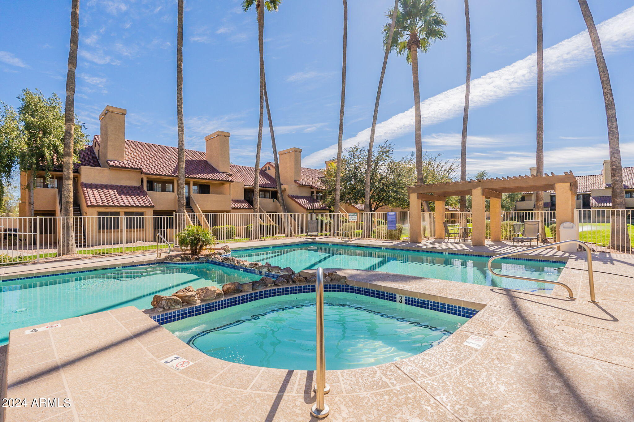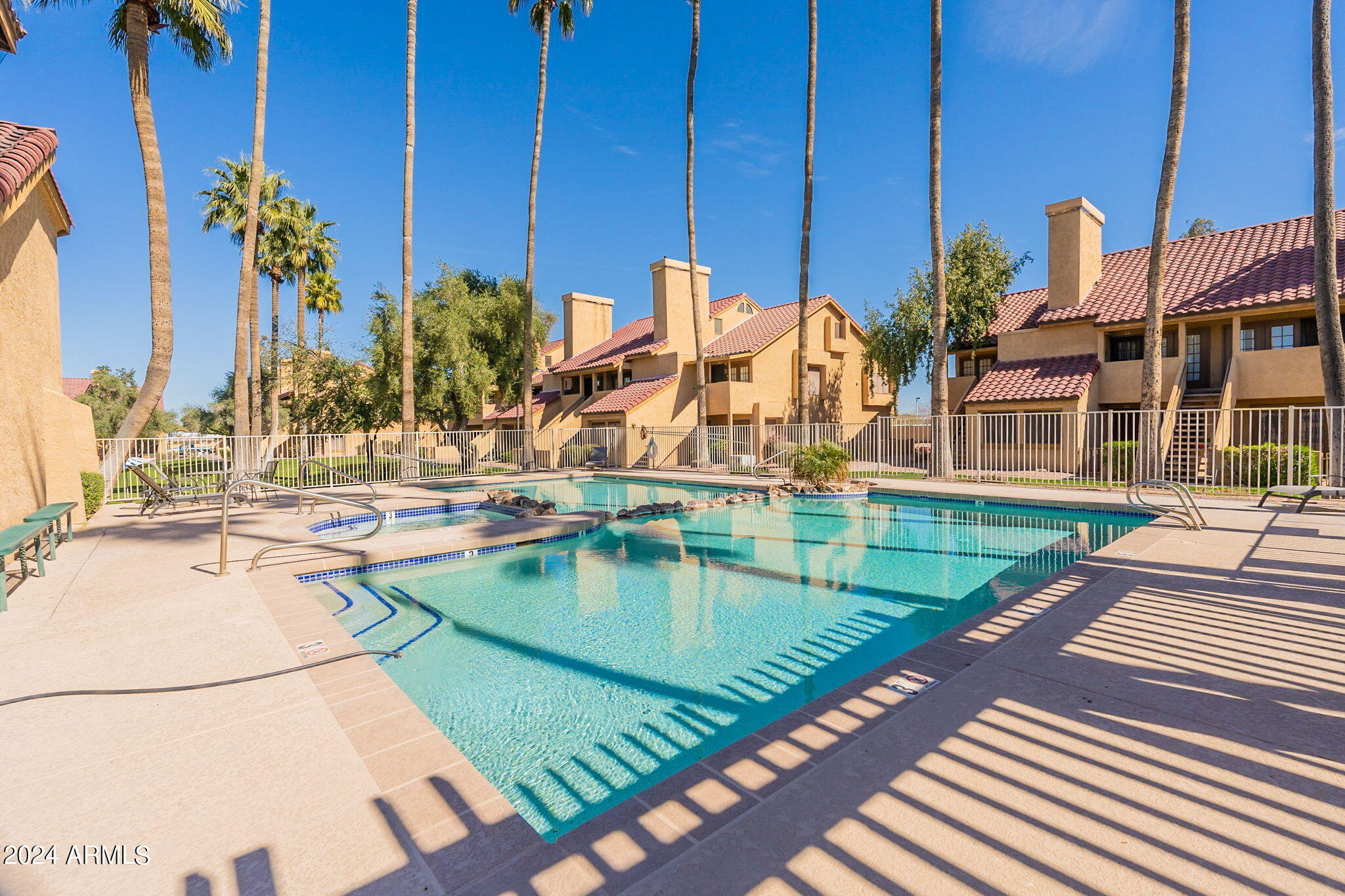 This fantastic unit showcases recently refreshed interiors with LVP floors and carpeting installed just a year ago. Cozy up by the fireplace and enjoy the convenience of a one-car garage. Each bedroom has its own sink, while a shared bathroom offers a separate toilet and shower. Outside, the common areas offer a sparkling pool and a heated spa for relaxation. Conveniently located with easy freeway access for commuting to the airport, downtown, or Tempe. Nearby shopping and dining options complete the picture of convenience and comfort.